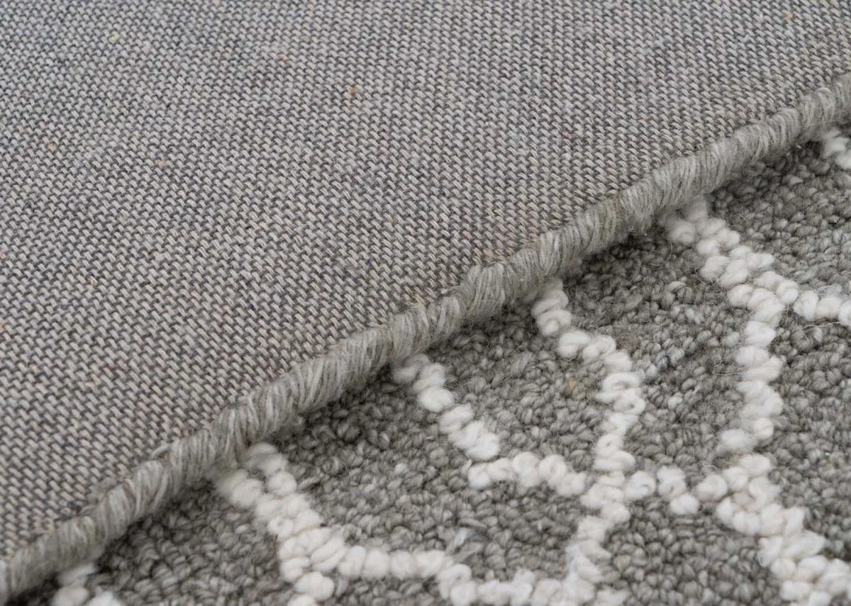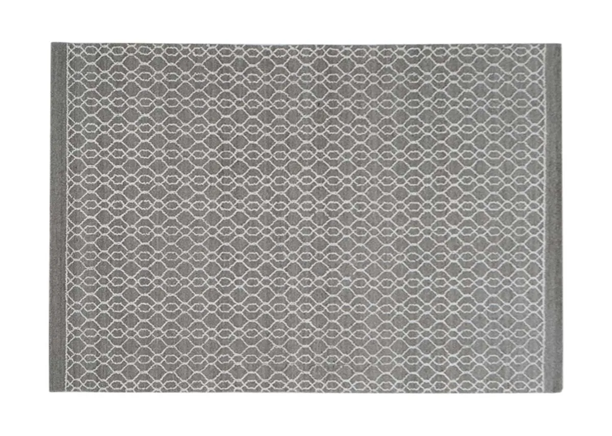A grey medium rug with an ivory woven thread design in a honeycomb pattern.