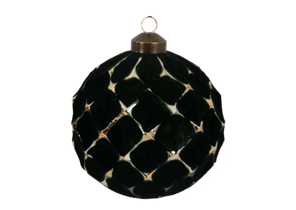 A set of four matt green 10cm baubles with lightly distressed gold lattice edges.