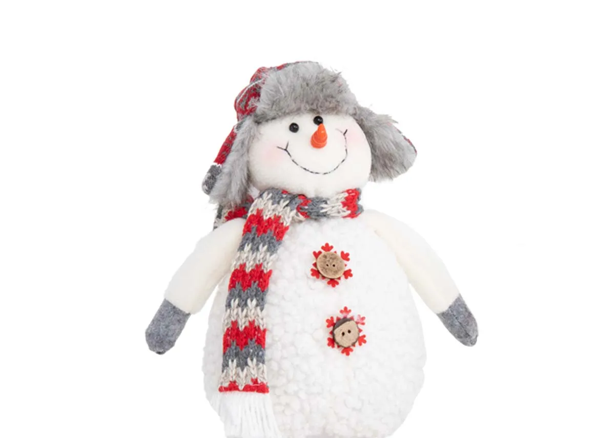 A festive Snow characters in red festive grey and grey wooly hats scarves and boots.