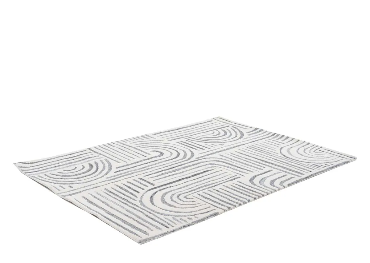 A small 120cm x 170cm ivory rug with grey geometric swirls and abstract textile design that would suit modern and bohemian interiors.