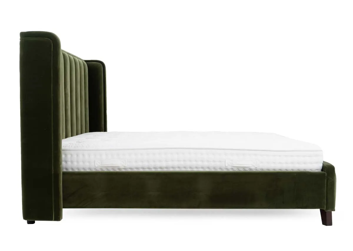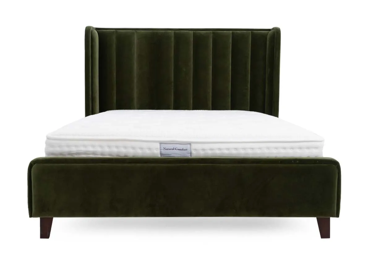 Beautiful in olive green the Lowe 5ft bedframe boasts a padded headboard with vertical panels, offering comfort and practical style.