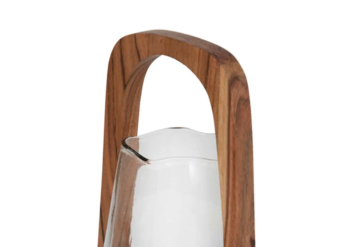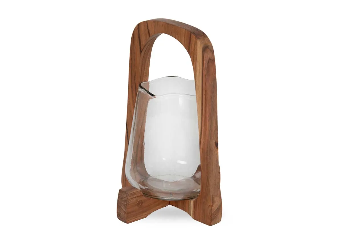 A large wooden stand with a glass tumbler holding a place for a candle.