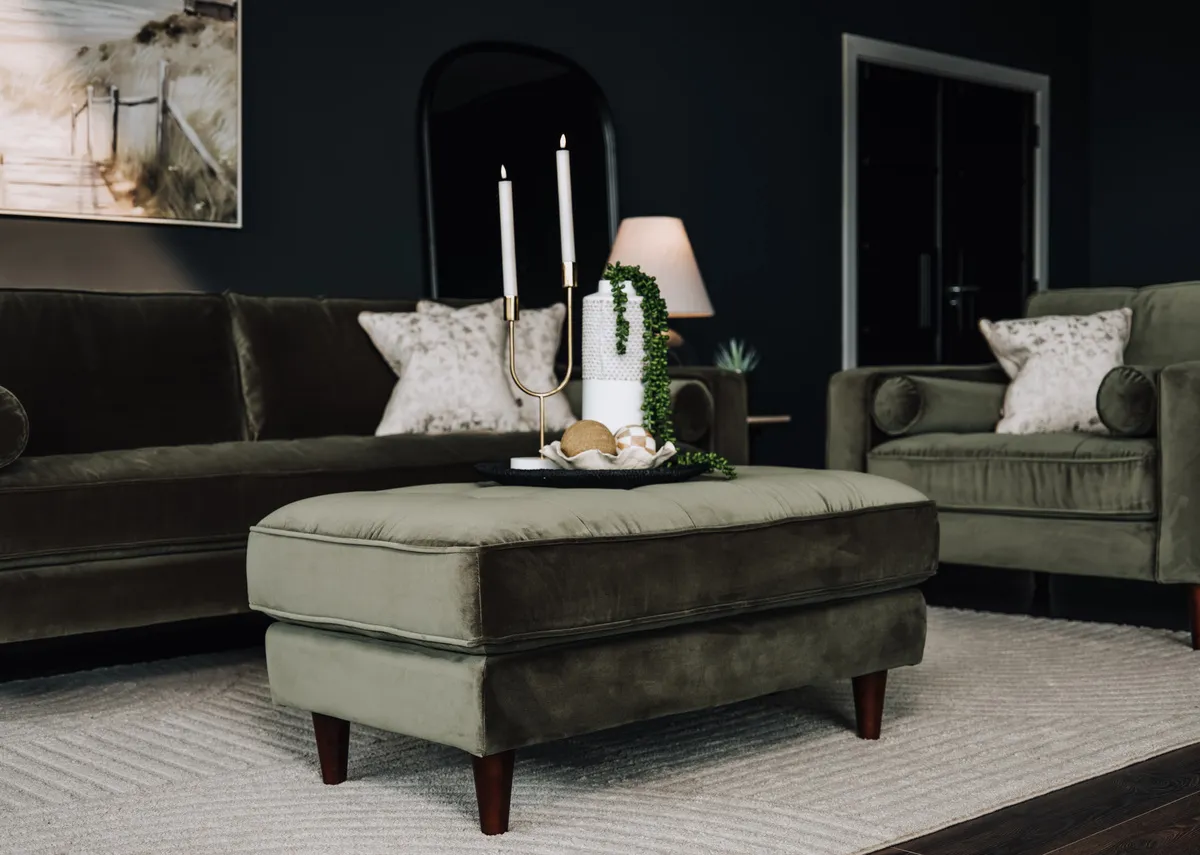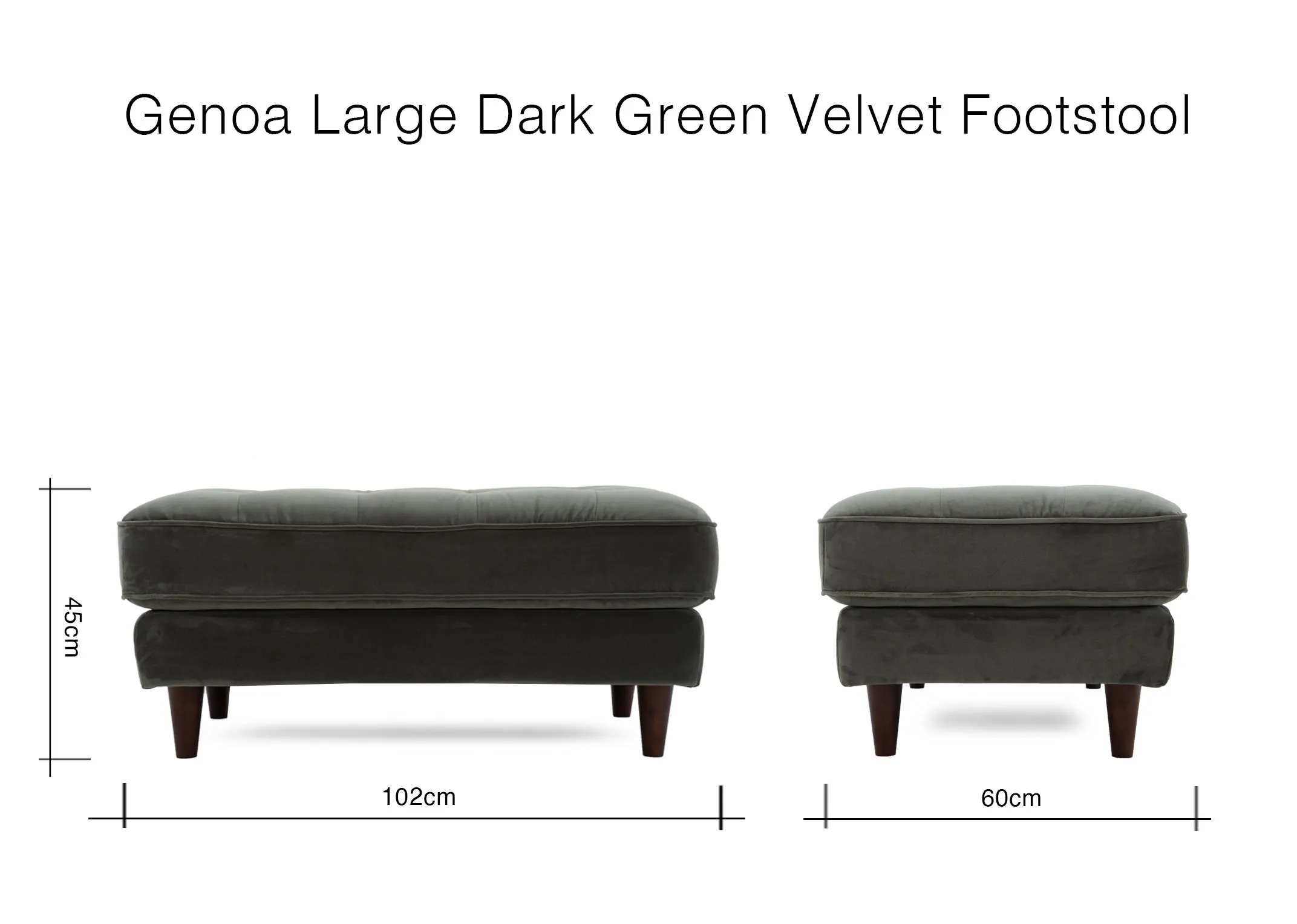 Sultry in dark green velvet, the Genoa footstool with walnut wood feet is stunning as an extra seat or for resting your feet on.