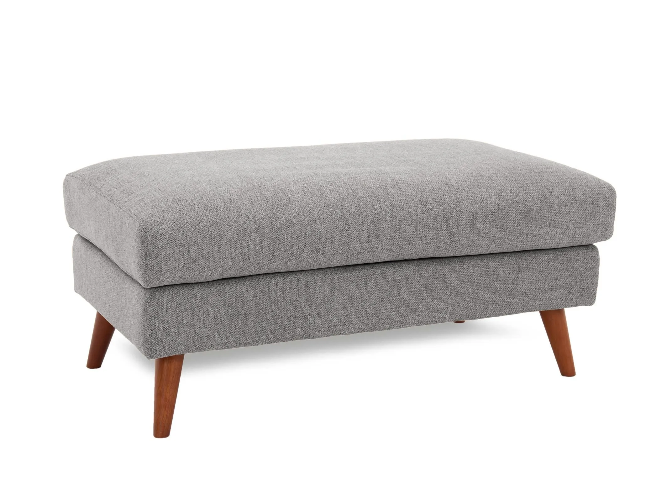 A large generous rectangular padded footstool in a light grey fabric with walnut legs that doubles as seating, and is perfect for both modern and retro homes.