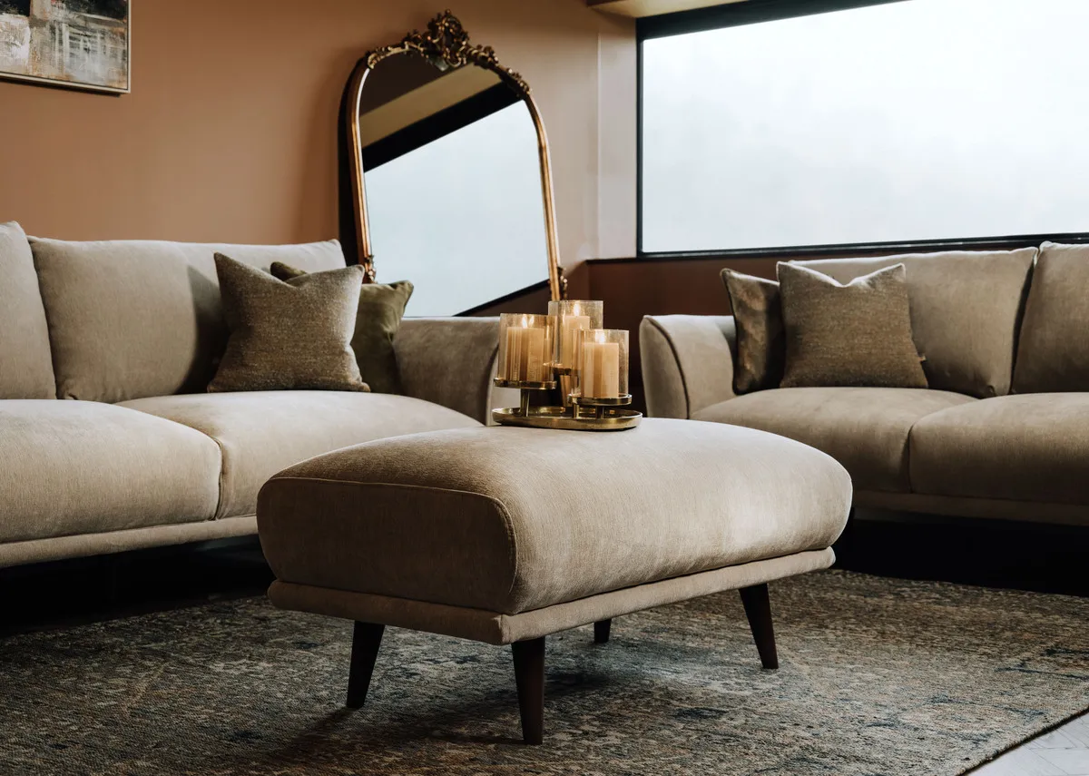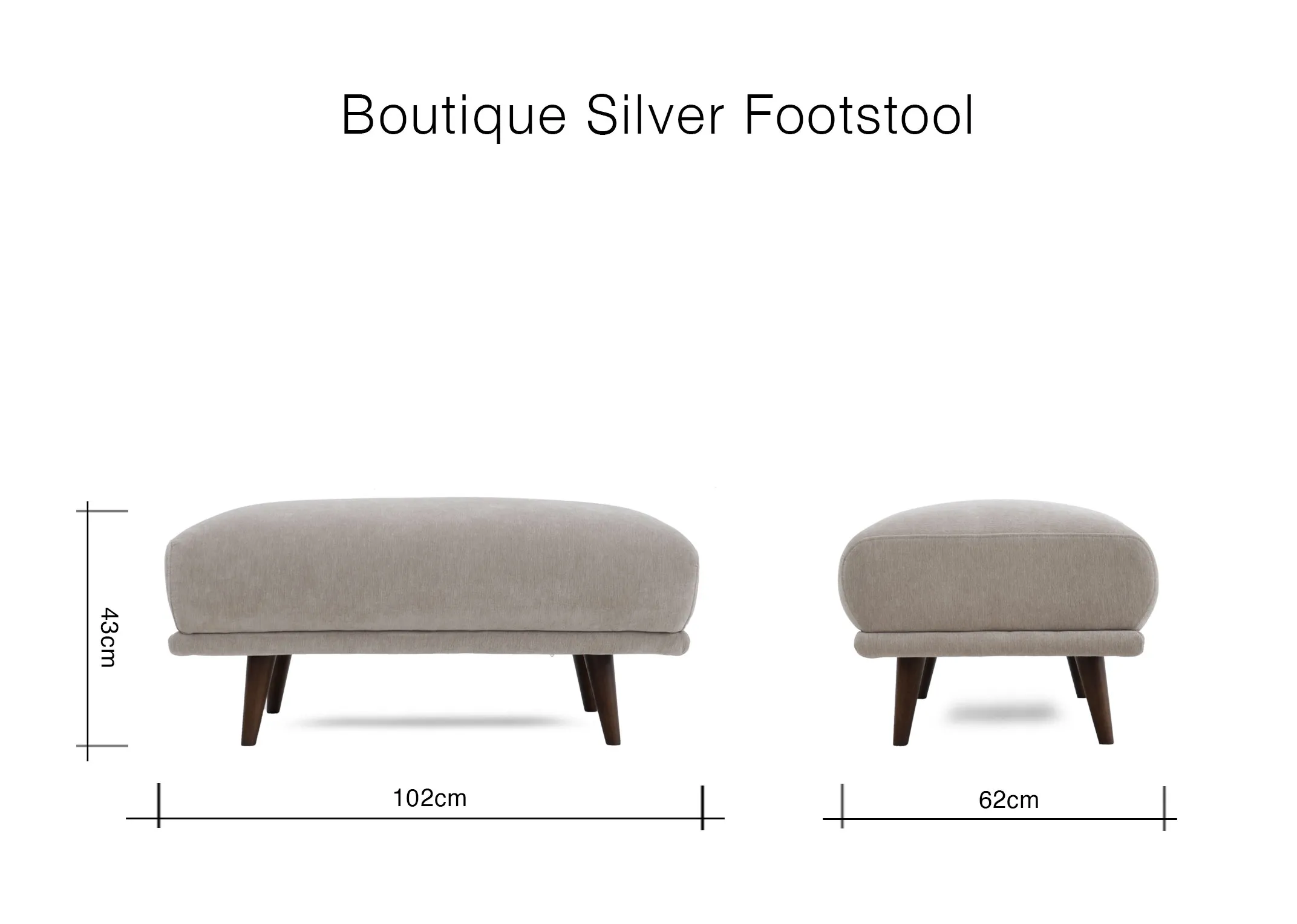A rectangular footstool in a soft silver fabric with dark brown wood feet, large enough to use as a spare seat.