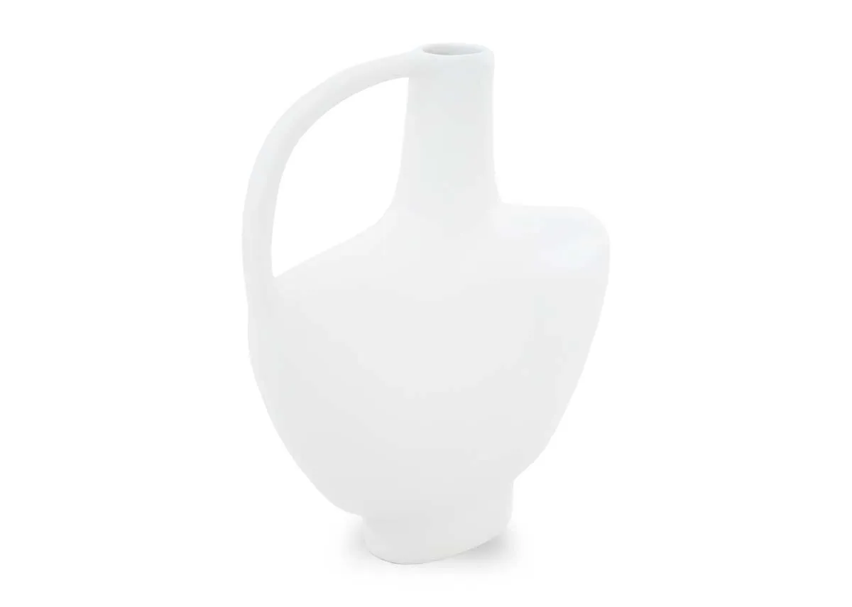 A white deco vase with handle, just add stems or display with other ornaments on your sideboard or shelf.