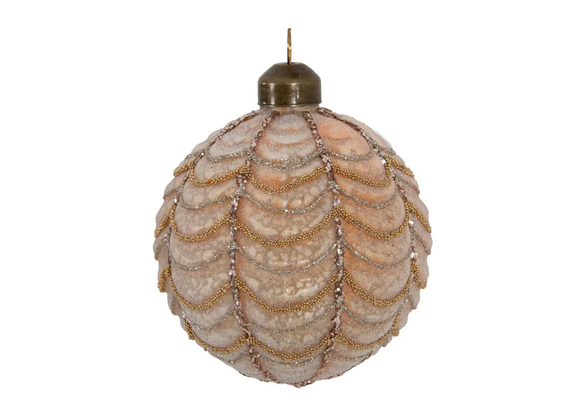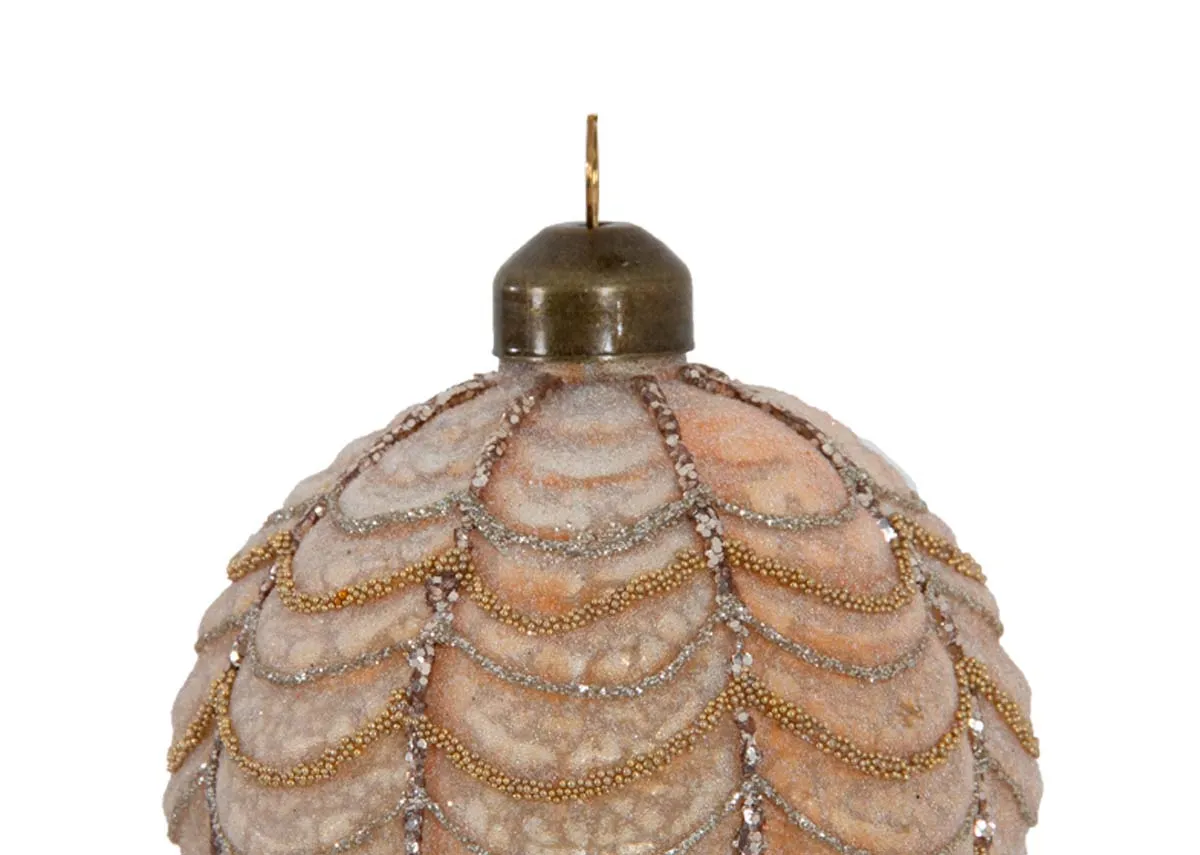 A set of four light brown glass 10cm baubles with rows of folded gold & silver beading.