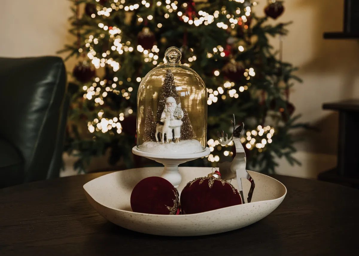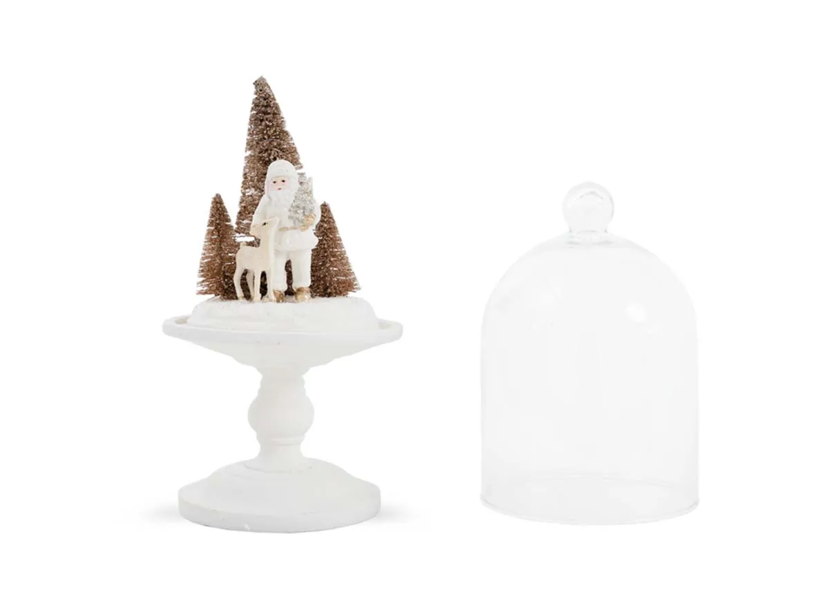Three fir trees form the backdrop for Santa and his reindeer in the striking LED ornamental glass cloche.
