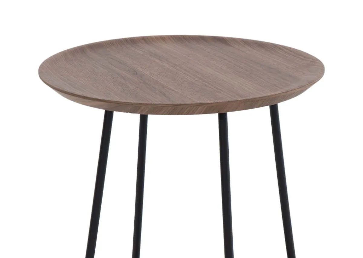 A round side table with a wooden tray style top ideal for smaller spaces and for holding your book and refreshements.