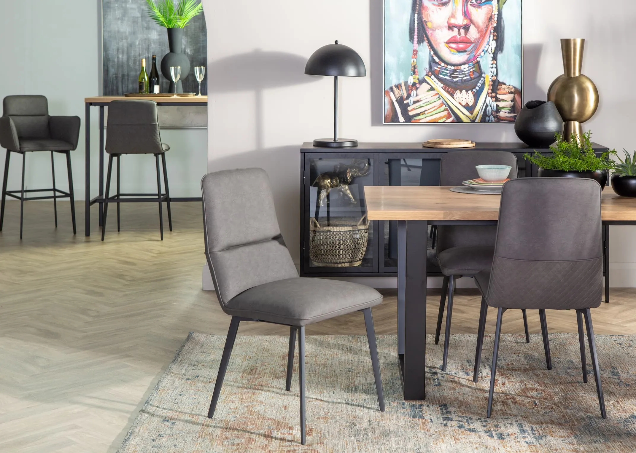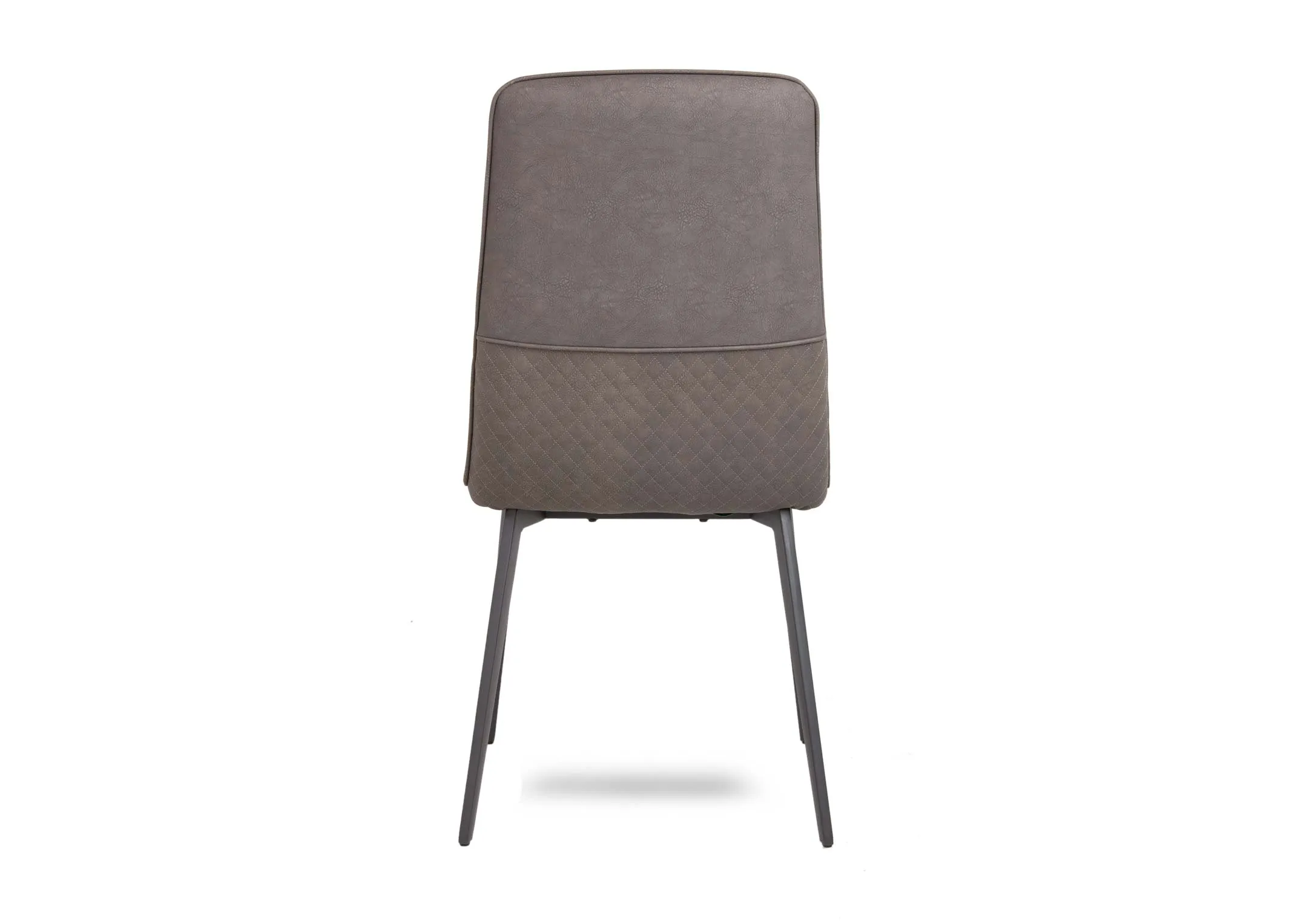 On-trend and comfortable light grey faux leather dining chair with black metal legs. Complements any decor.