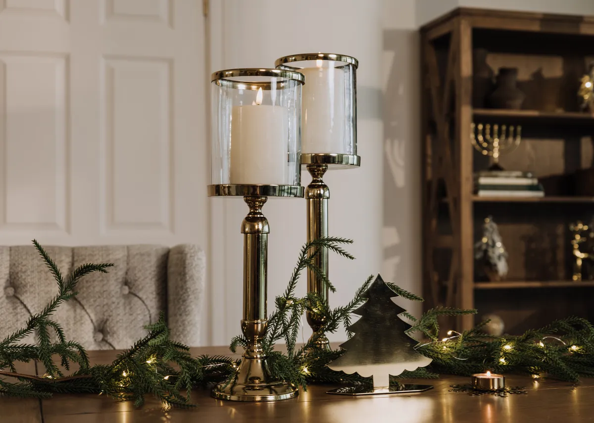 Medium Pillar on Gold Stand- Christmas Candle Holder