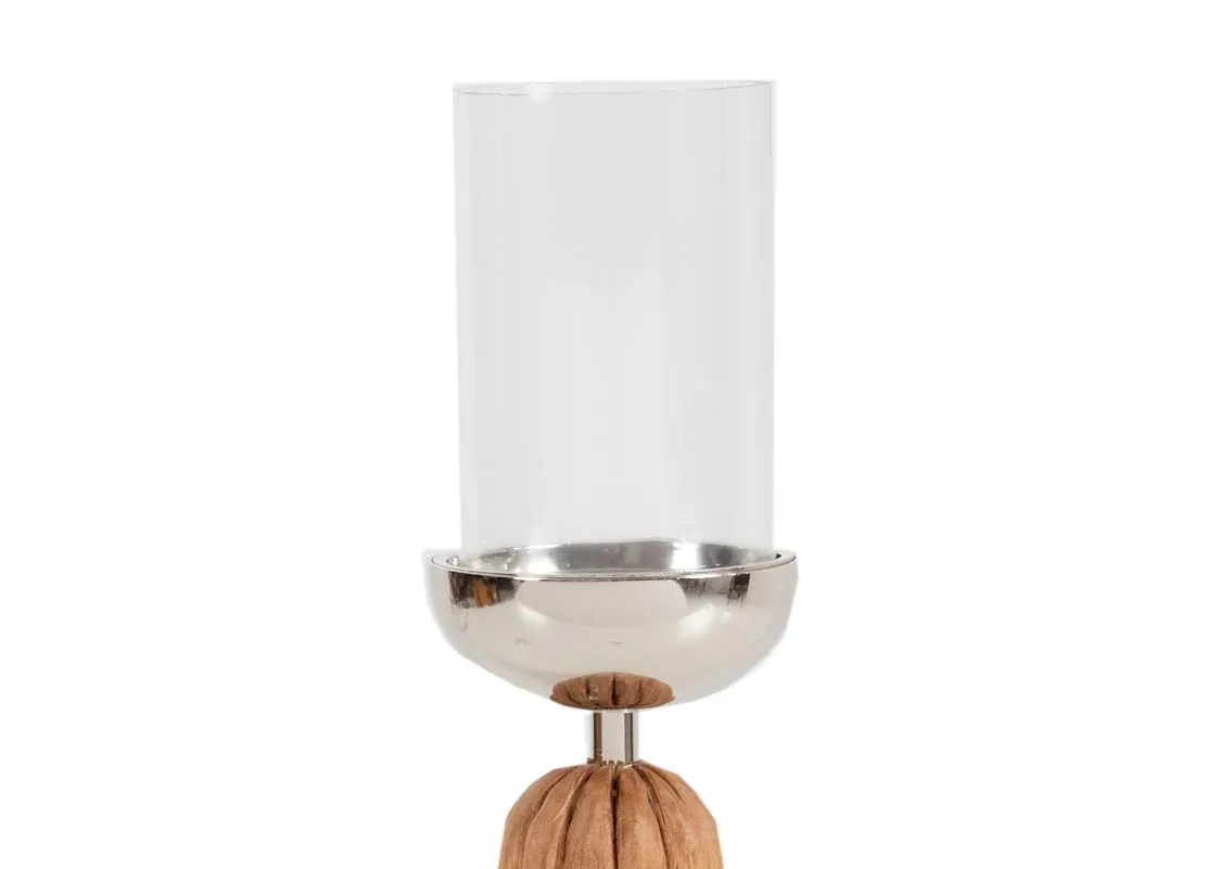 Transform your interior with organic texture and sleek design using the Medium Wood Pillar Candle Holder with Glass.