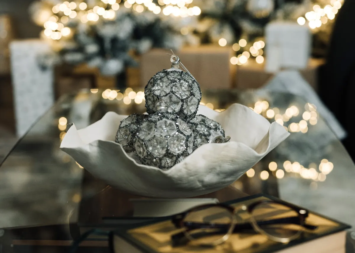 A set of four Art Deco style 10cm Christmas baubles with a lattice pattern trimmed with charcoal glitter snowflakes.