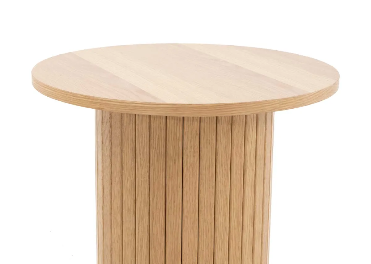 A mid century inspired design this round oak lamp table has a pedestal slat wood finish, ideal for most interiors.