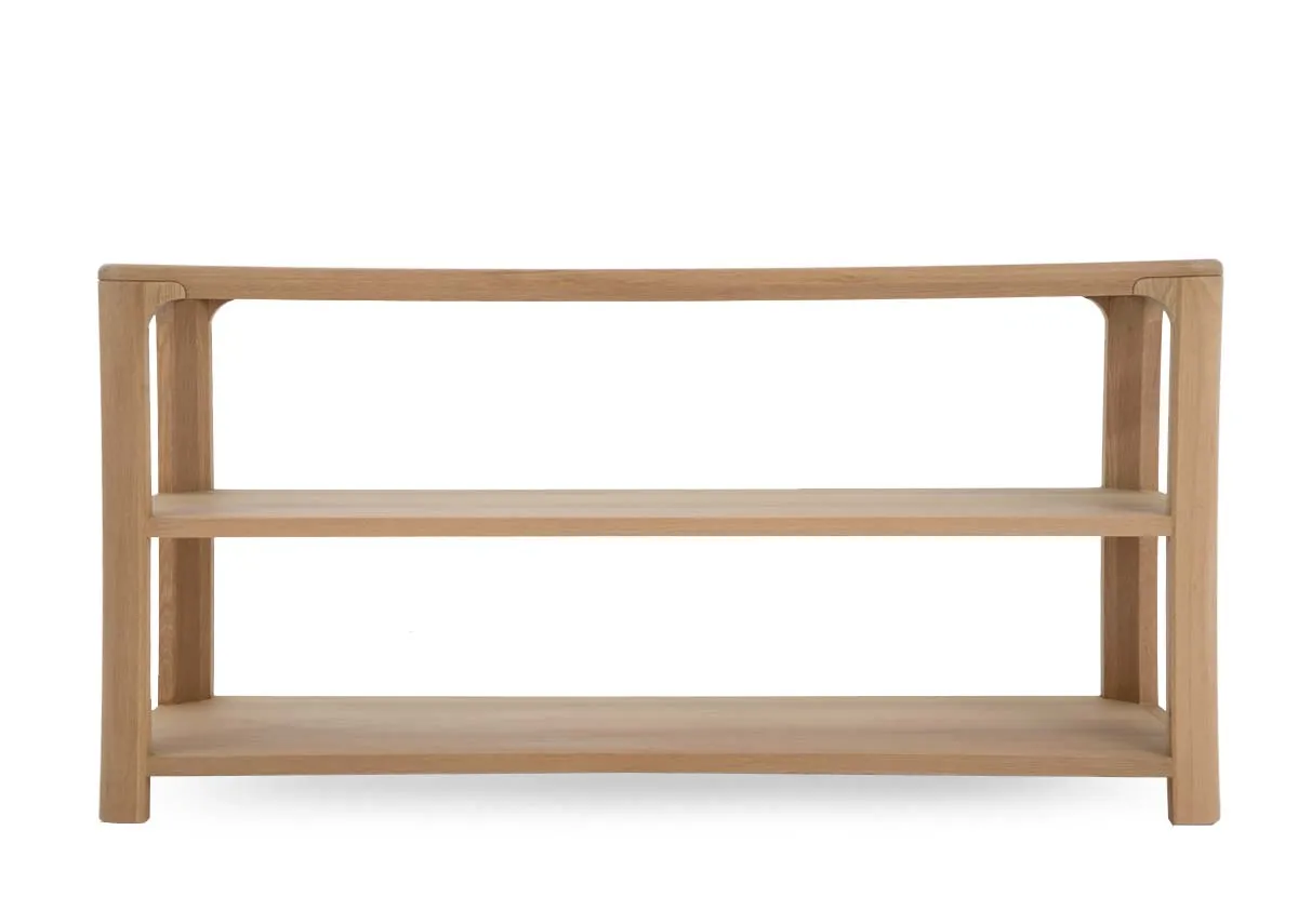 A classic oak framed console table with an easy wipe glass top with 2 lower shelves for storage and display.