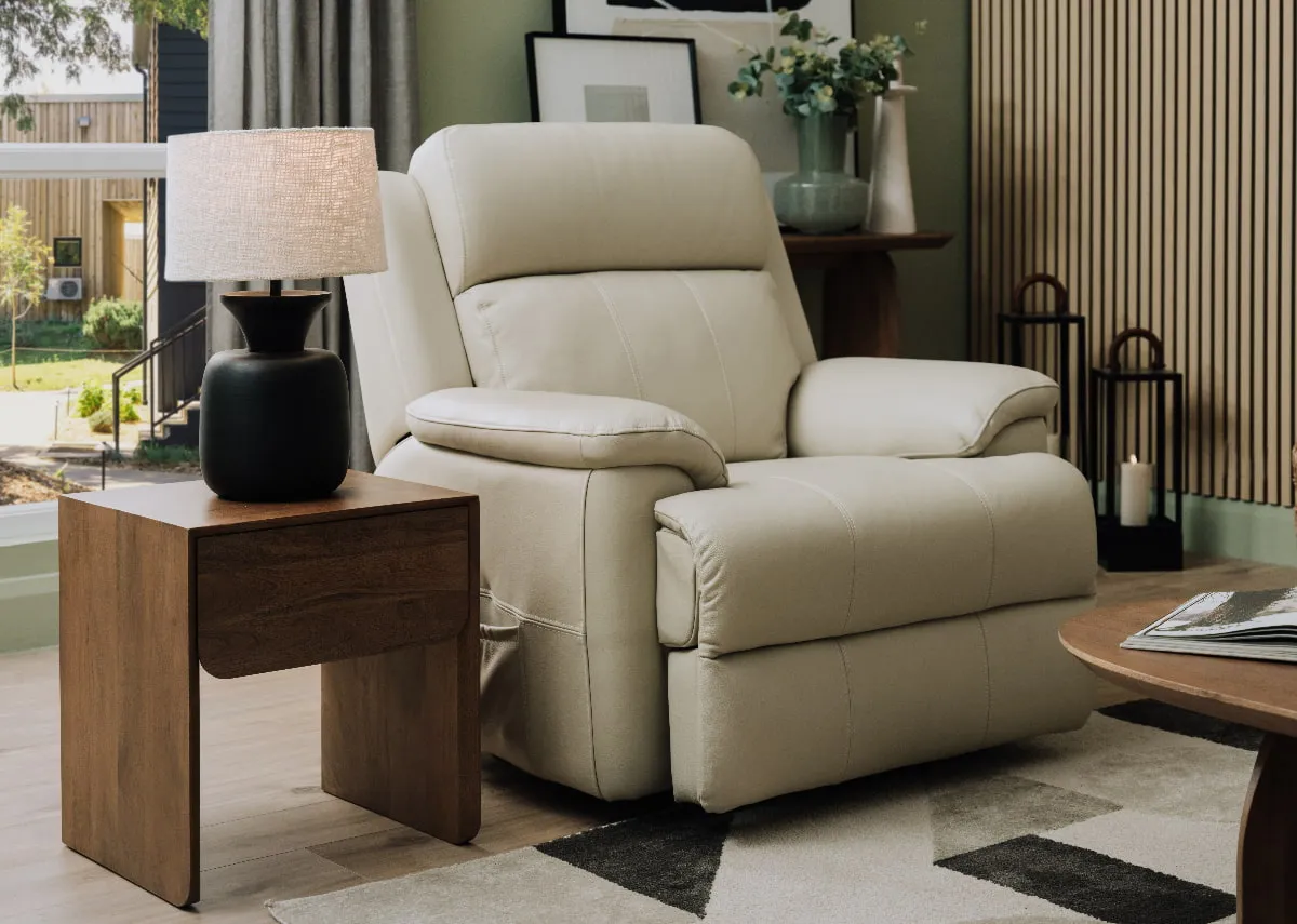 Stylish off-white leather armchair with exceptional support, foam-filled seat cushions, and fibre-filled back cushions.