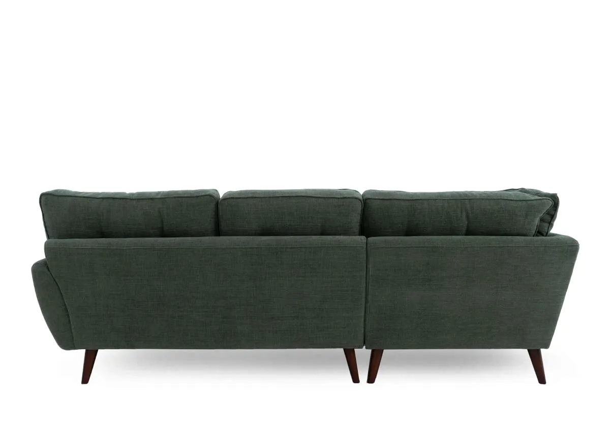 Casual but stylish, the Caoimhe olive green corner sofa has a deep seat, comfy cushions, and tufted details that enhance its retro style.