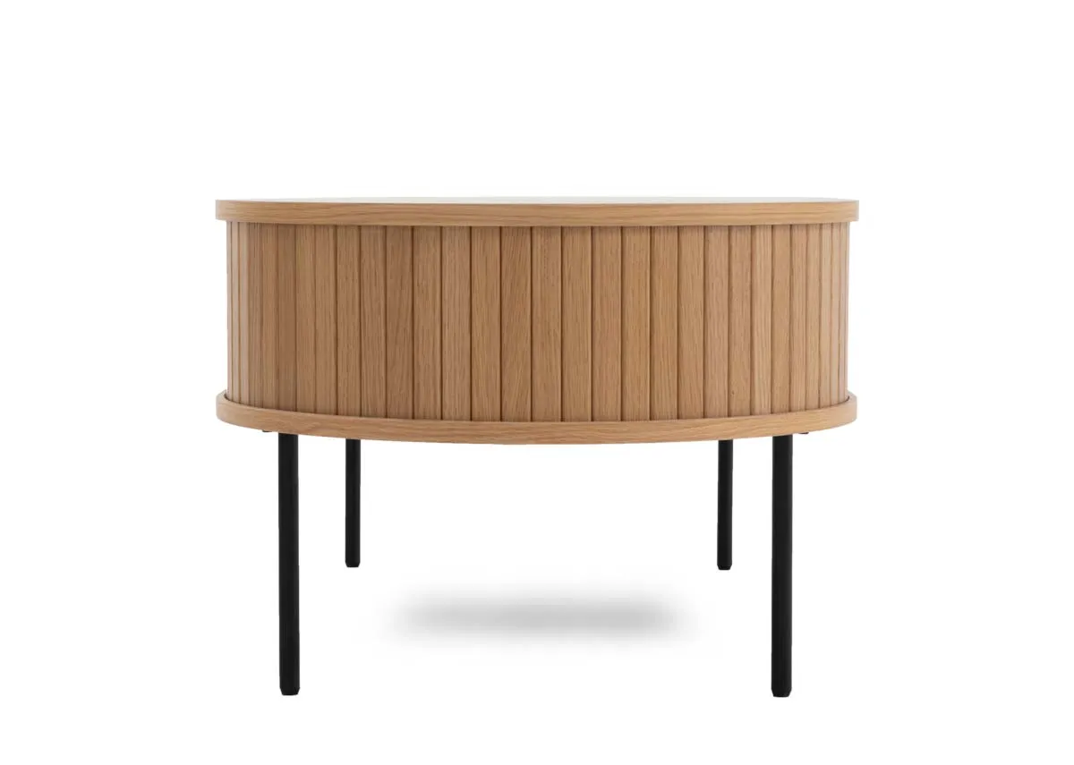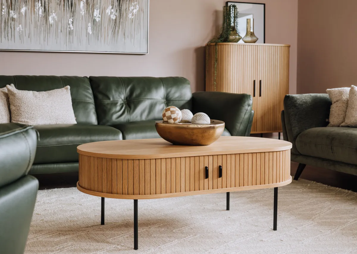 An oval natural oak coffee table with slatted veneer finish and a quick slide to reveal a storage shelf.