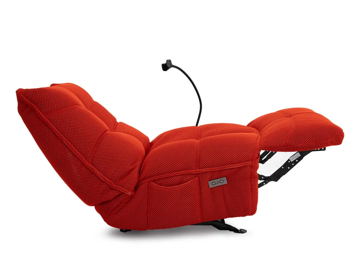 A bright red fabric power gliding gaming chair with thick foam filled seat for added comfort, a side pocket for remotes and handsets, usb charging port and a hands free phone holder.
