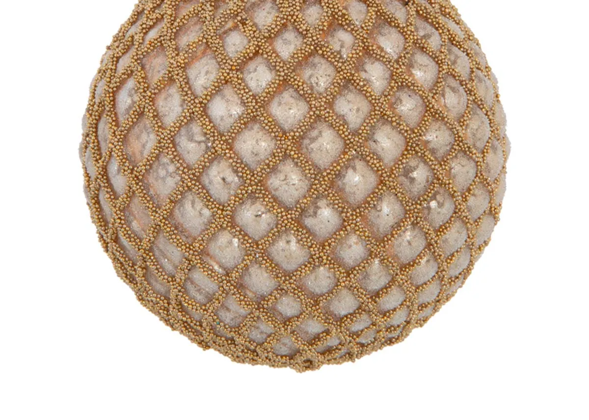 A set of four light gold textured 8cm Christmas baubles covered in a gold glitter framed lattice design.