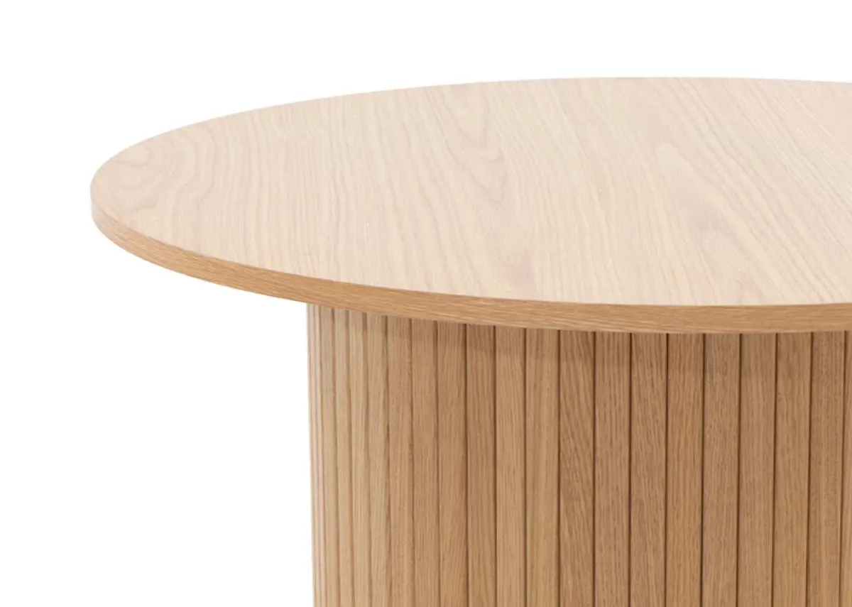 A mid century inspired design this round oak coffee table has a pedestal slat wood finish, ideal for most modern interiors.