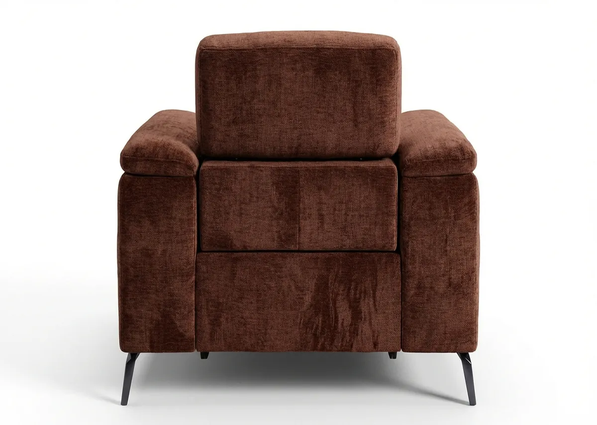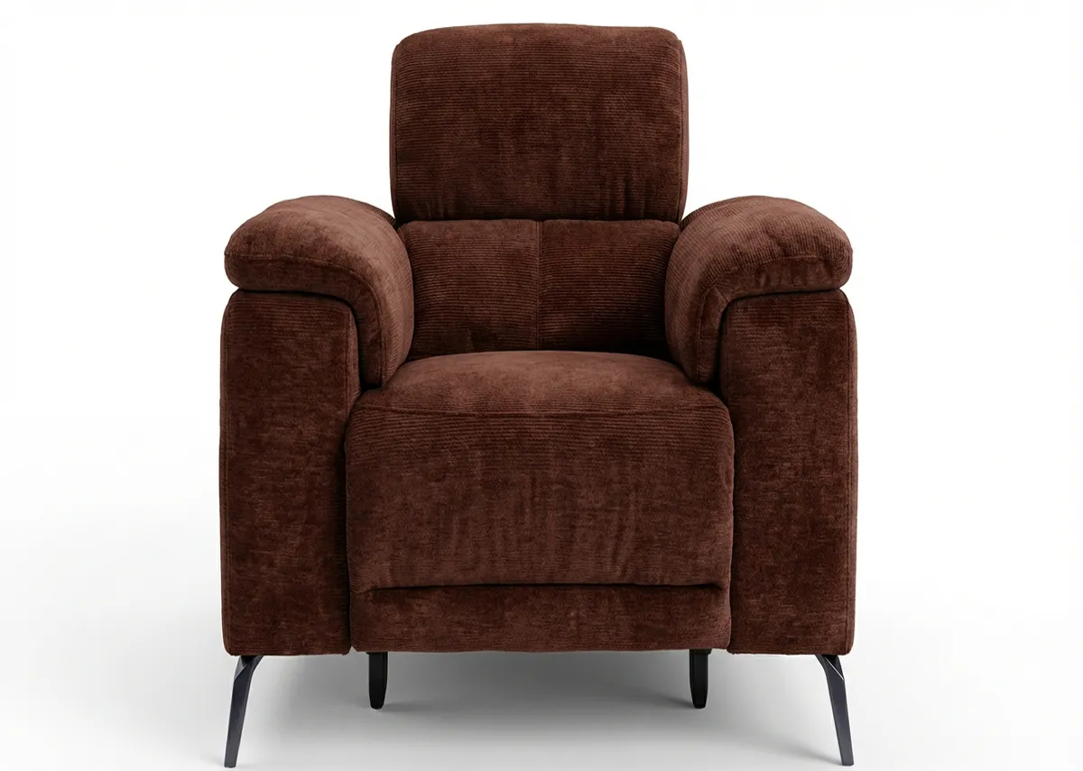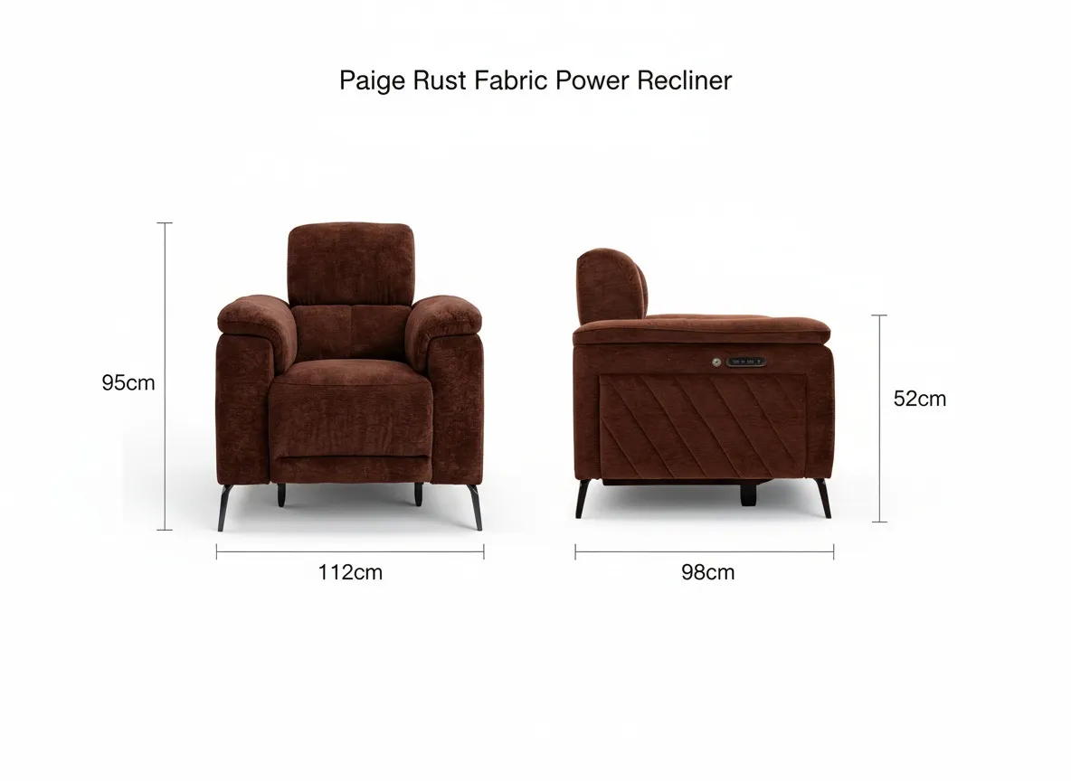 A power recliner boasting usb port and upholstered in a rich rust fabric with 10 year warranty.