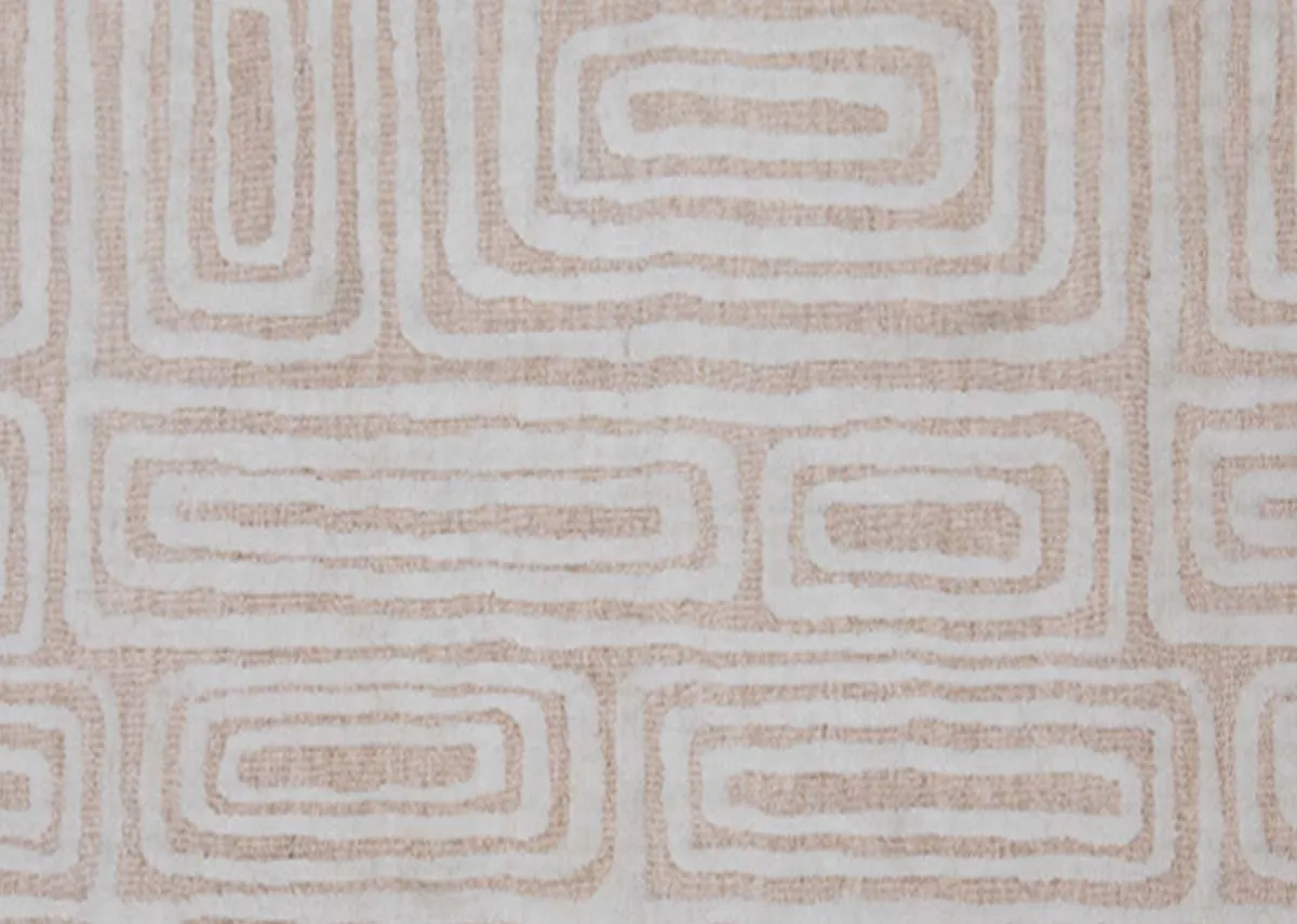 A large natural sand rug with short pile with a geometric pattern of soft edged rectangles inspiring a bohemian style.