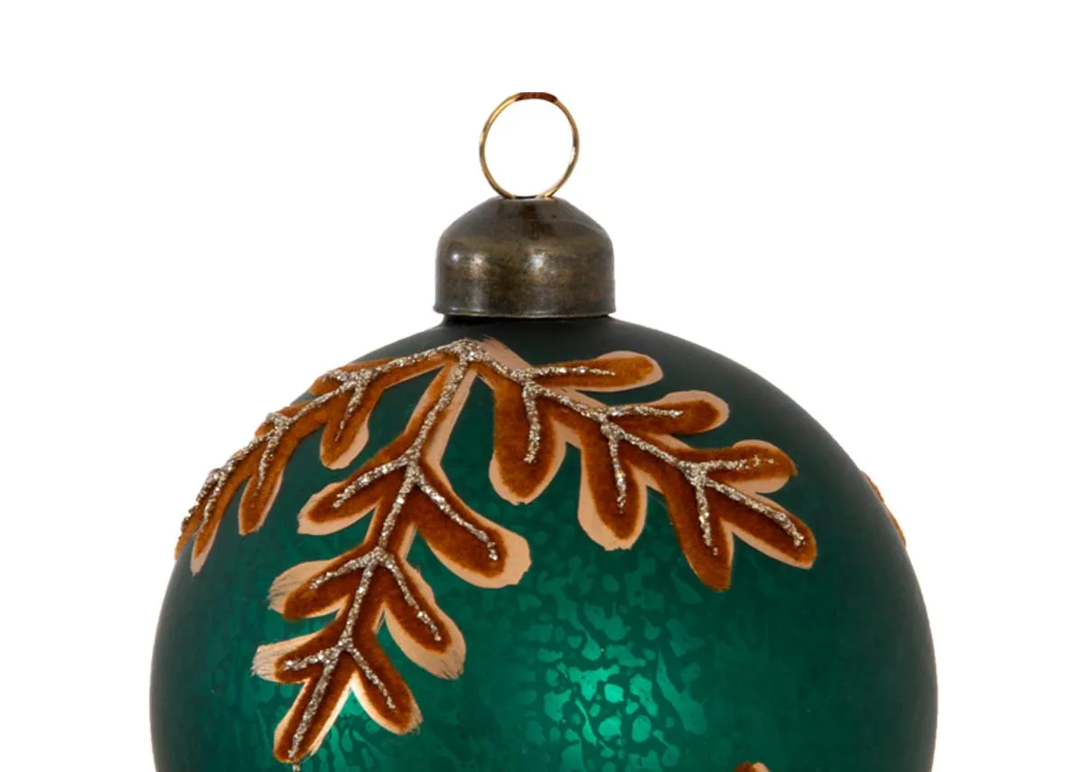A set of four 10cm Christmas baubles with a distressed bright green finish with exaggerated red leaves.