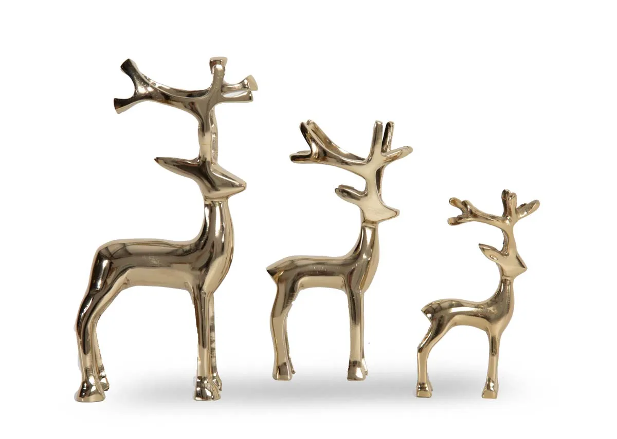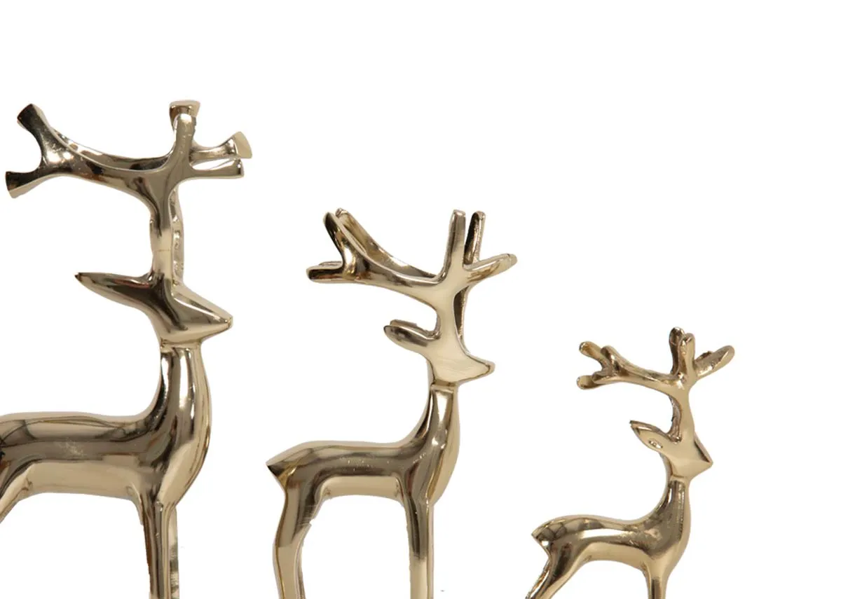 A set of 3 standing gold metal reindeer ornaments in alternate sizes which can be displayed together or alone.