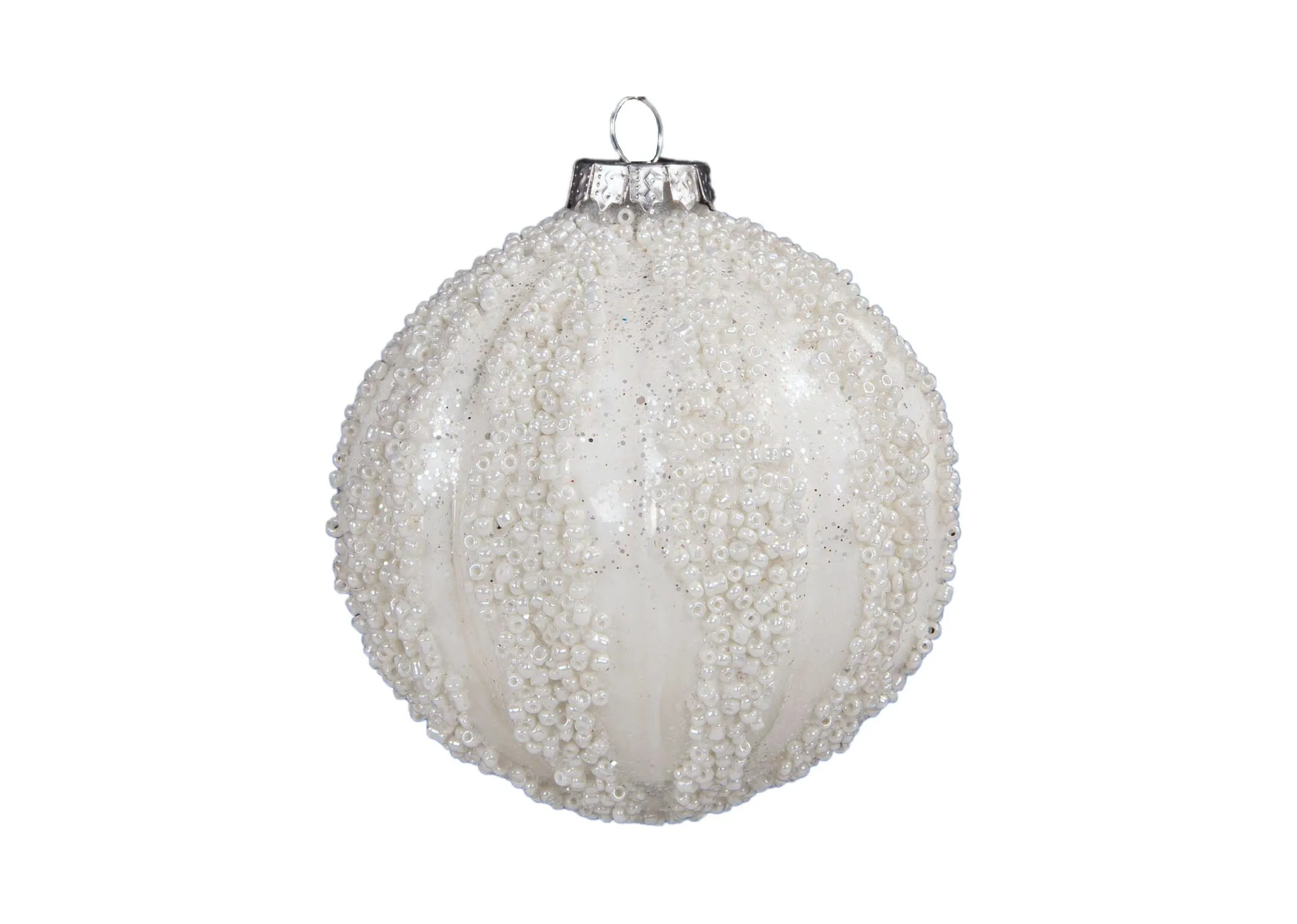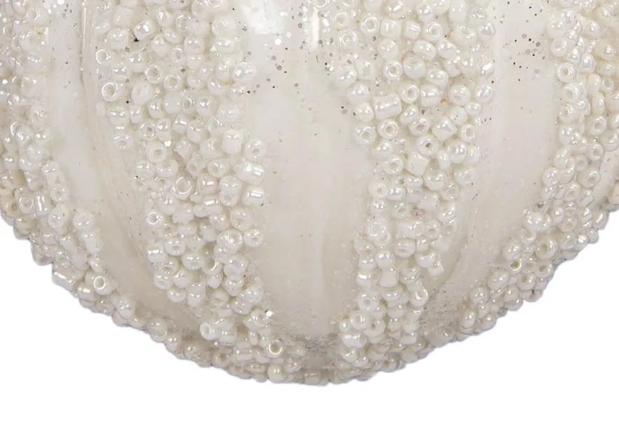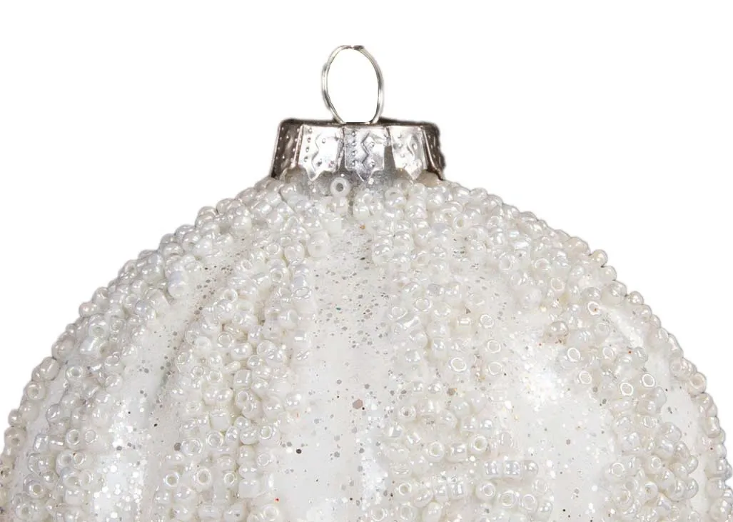 A set of four white baubles encrusted in tiny white beads and glitter.