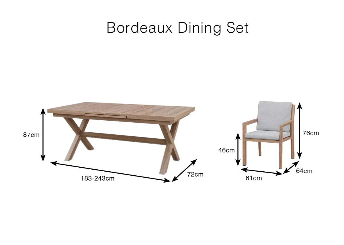 The striking Bordeaux garden dining set featuring an extendable table & 6 dining chairs with weather friendly removable cushions is sure to have you dining al fresco all year round.