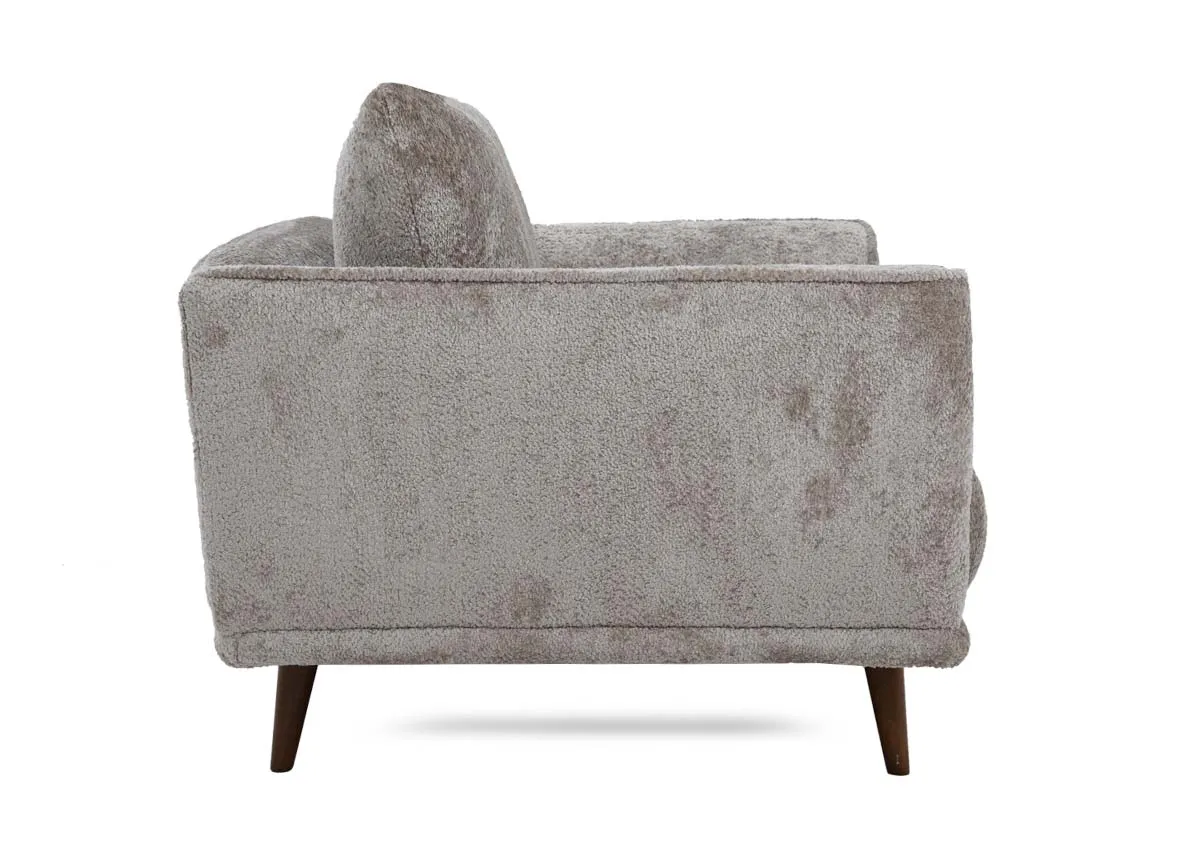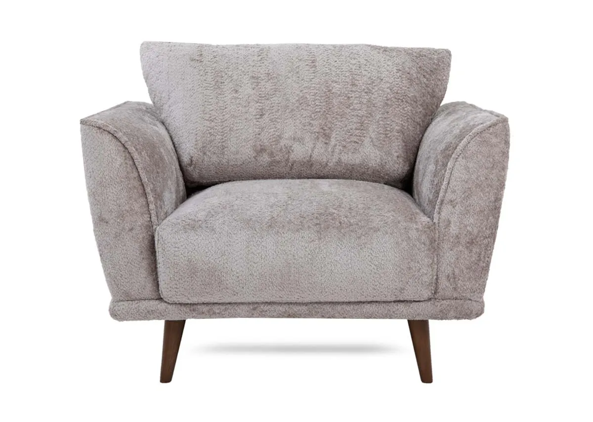 A wide cuddler chair upholstered in a taupe crushed velvet style fabric with dark feet.