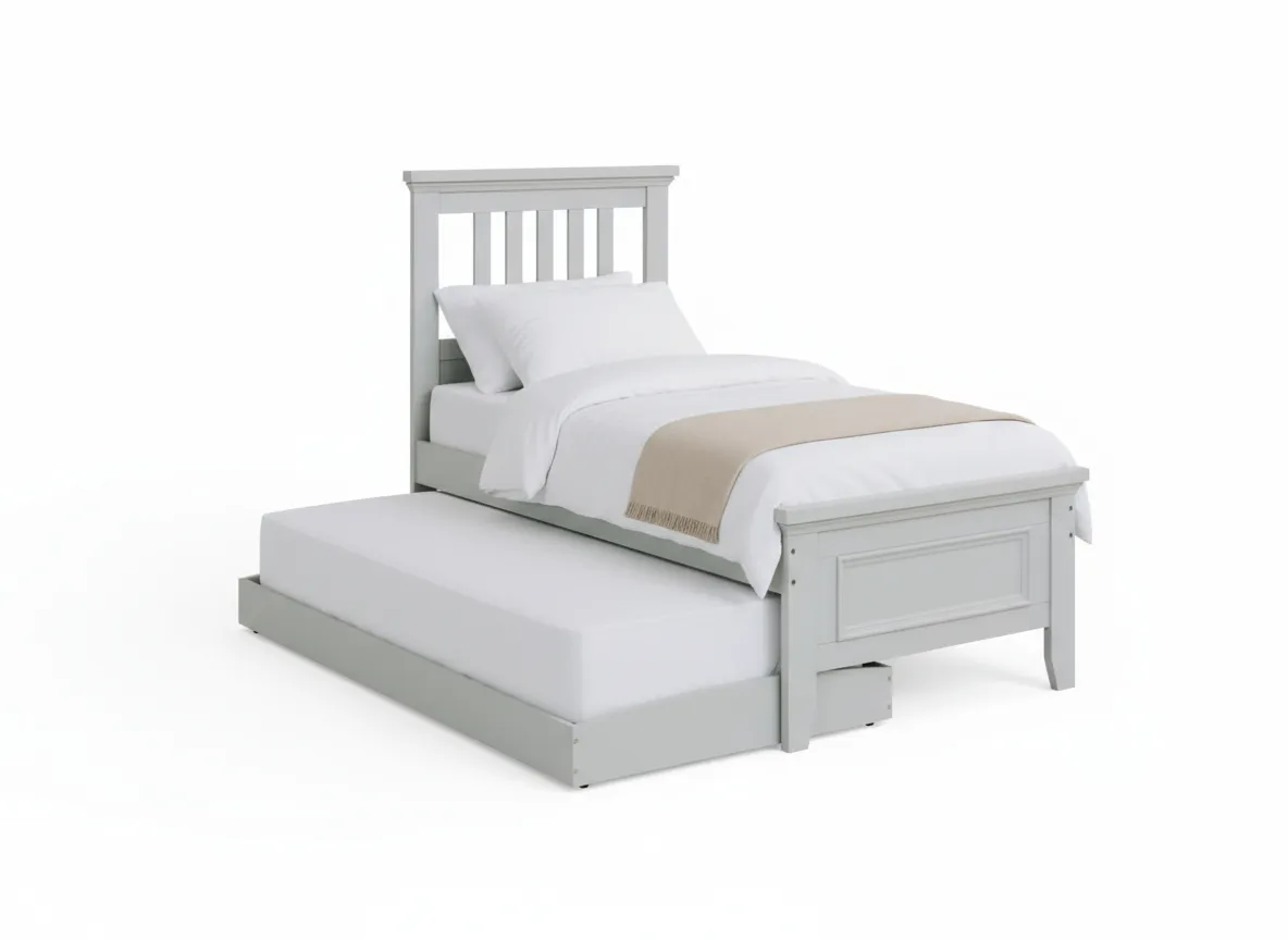 Maximize your space and welcome guests with the stylish Hudson Single Grey Bed Frame, featuring a convenient pull-out guest bed for effortless hospitality.