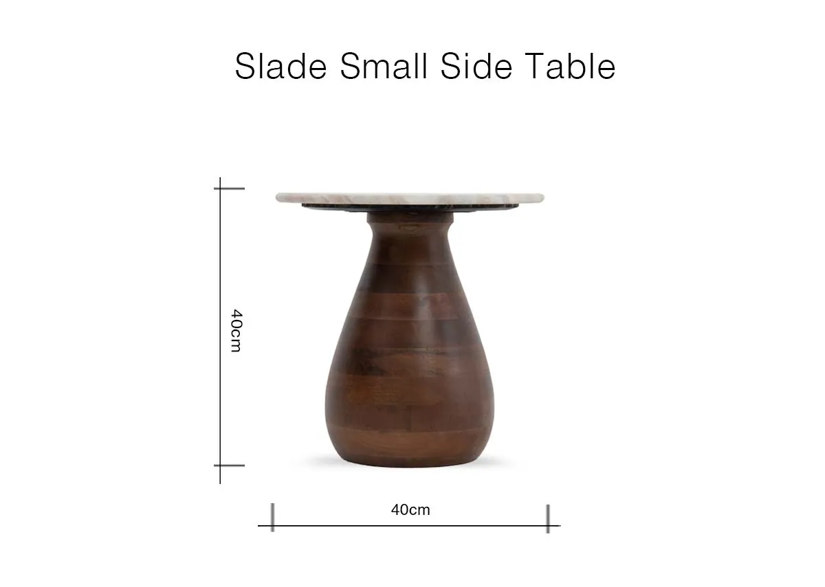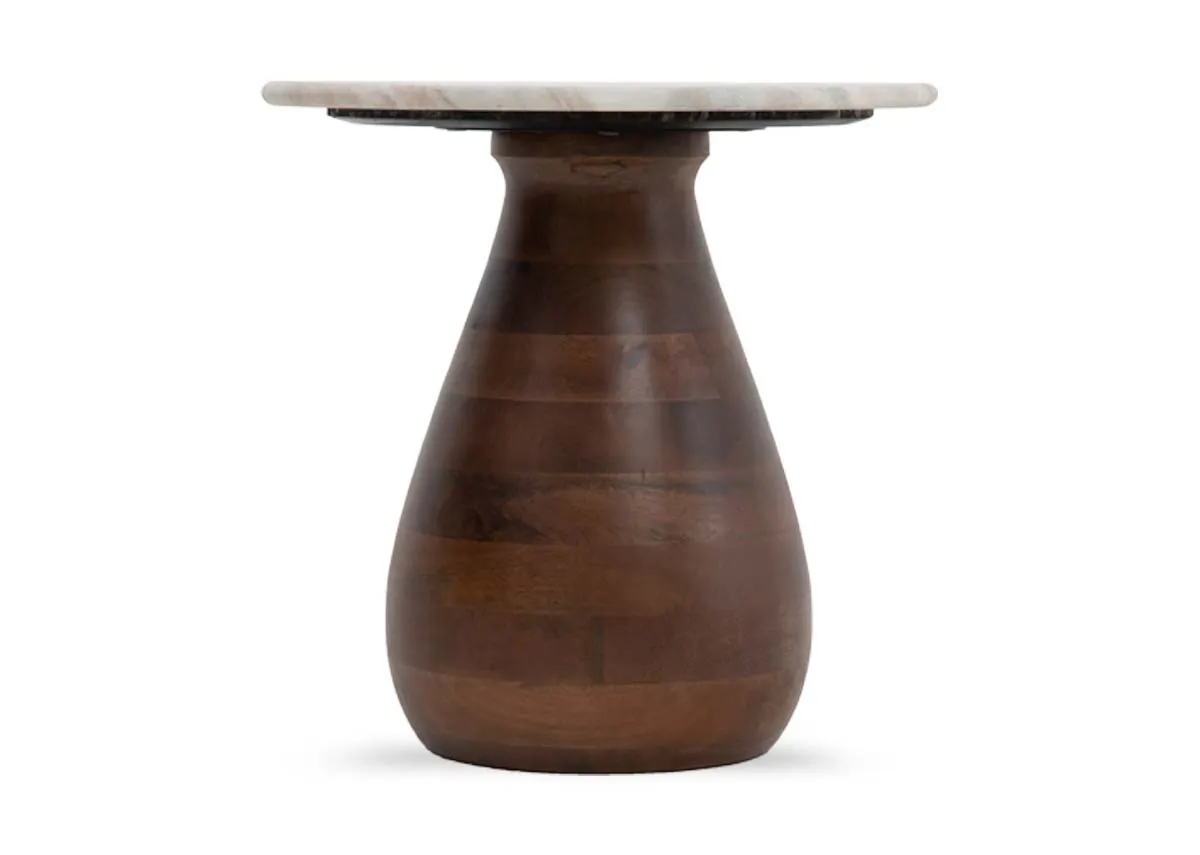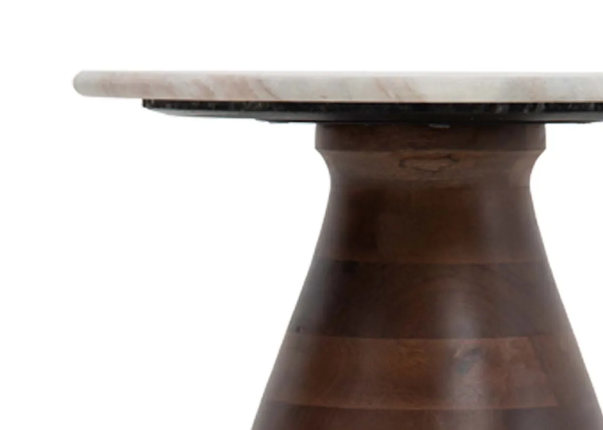 A small round top side table with brown wood solid base and off white marble effect table top.