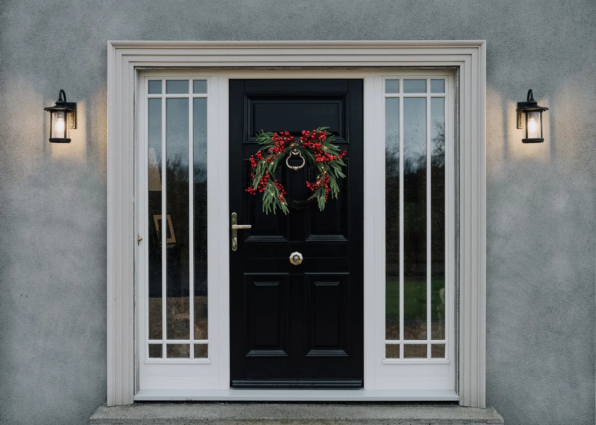 A Christmas hanging wreath with green foliage and faux-berries wrapped around a brown circular branch.