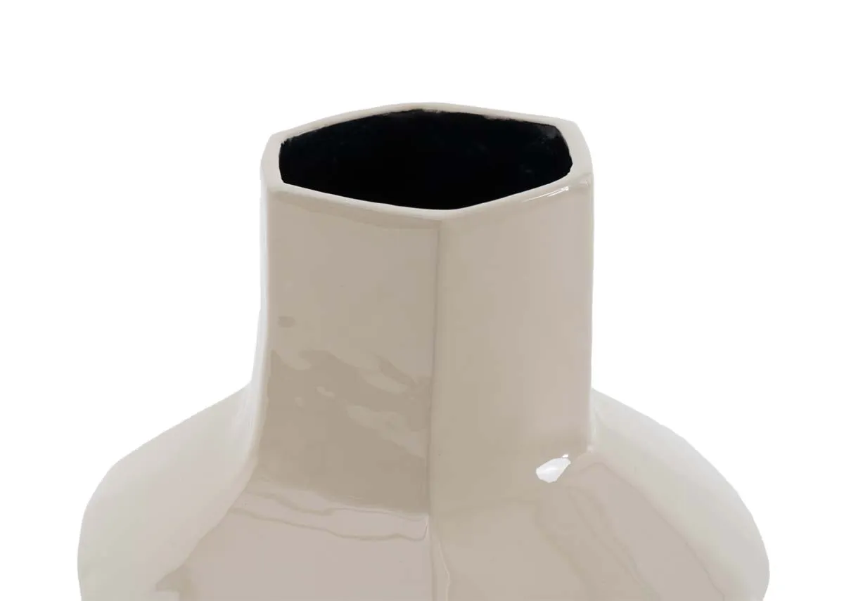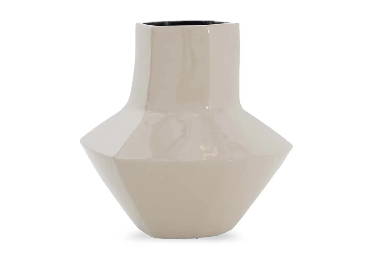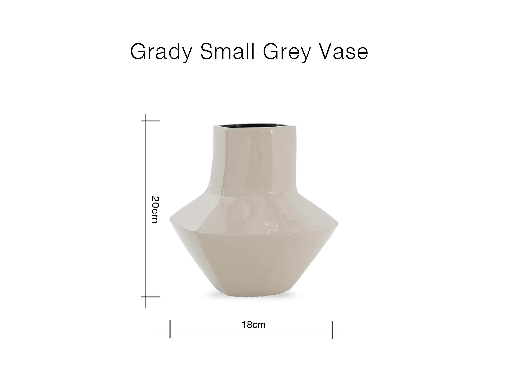 A small but artistic vase in a gloss light grey finish suitable for a table or shelf, with or without foliage.