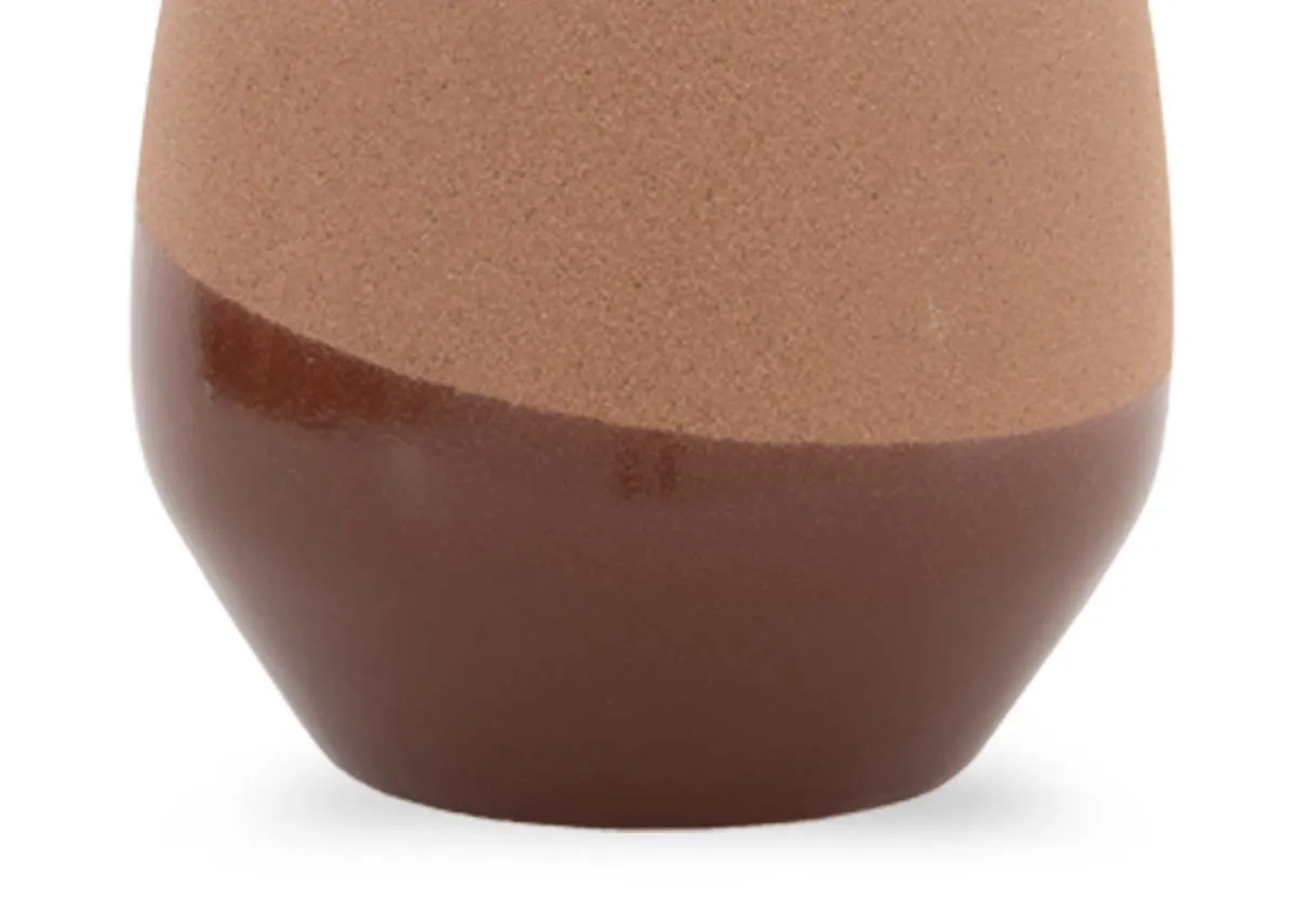 A small rustic vase with a gorgeous design of cream, terracotta and brown wide stripes giving this piece a charming effect.