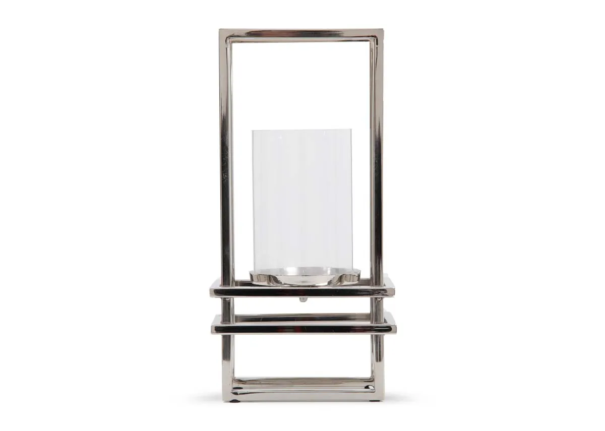 A small silver metal framed stand with glass holder for pillar candle.