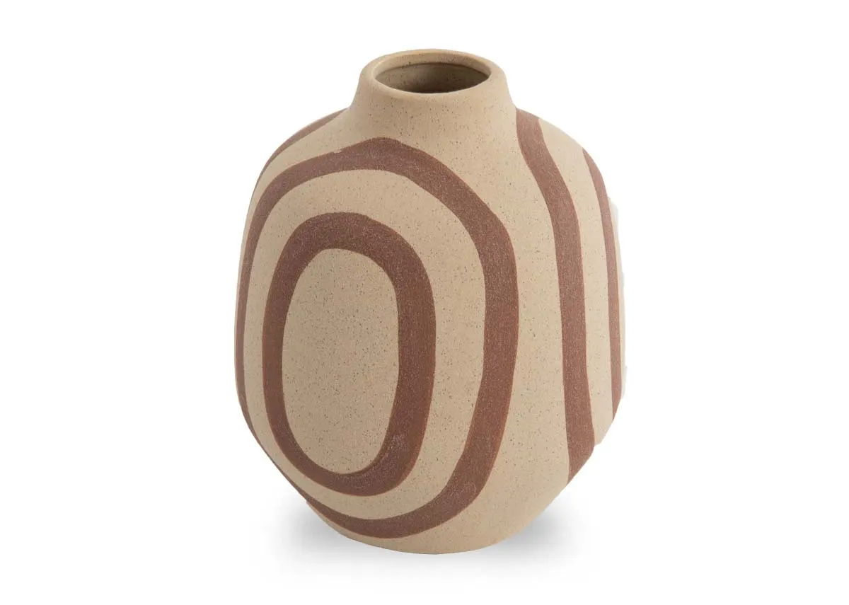A small rustic cream vase with a gorgeous design of brown centric circles gives this piece a charming ripple effect.