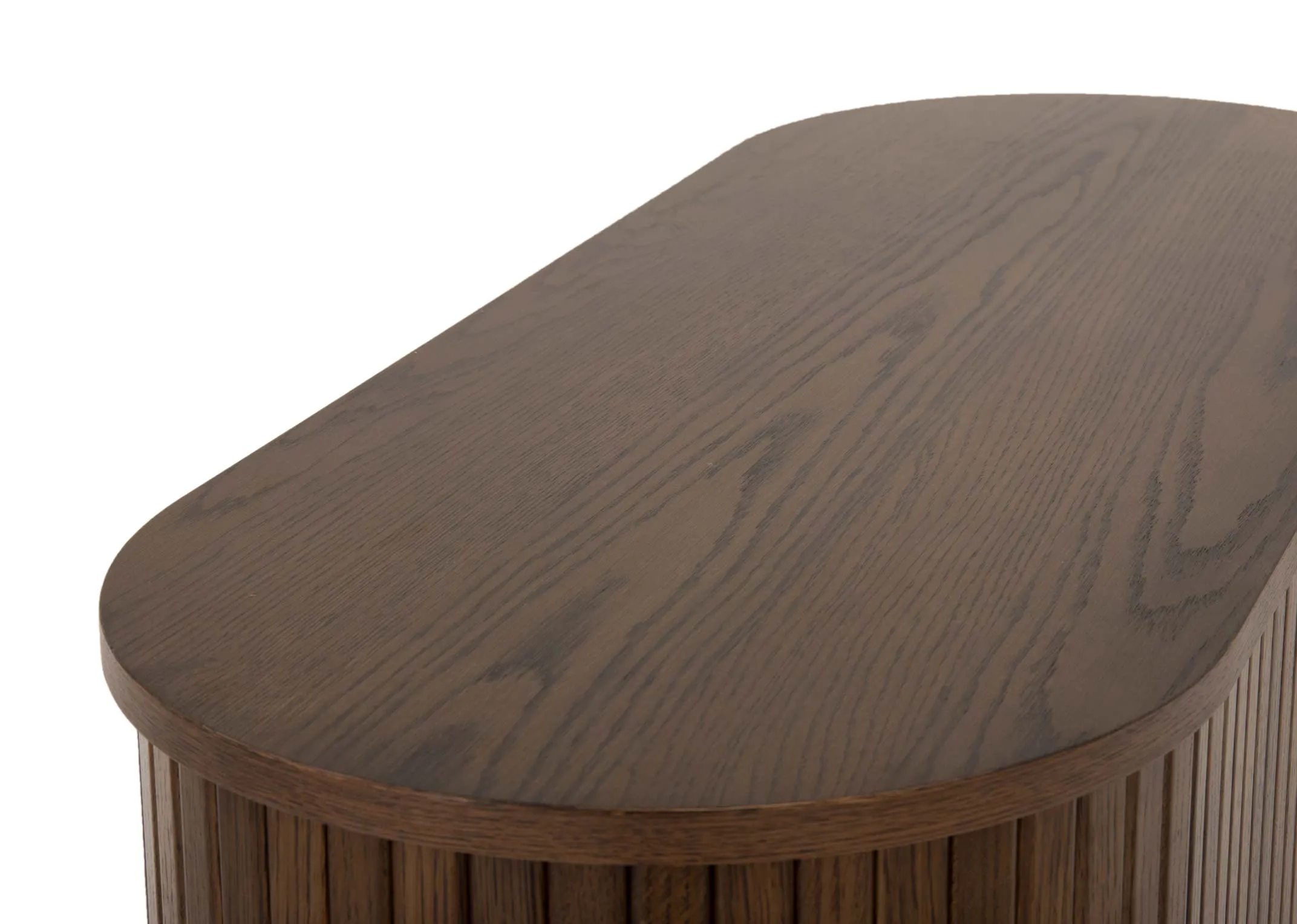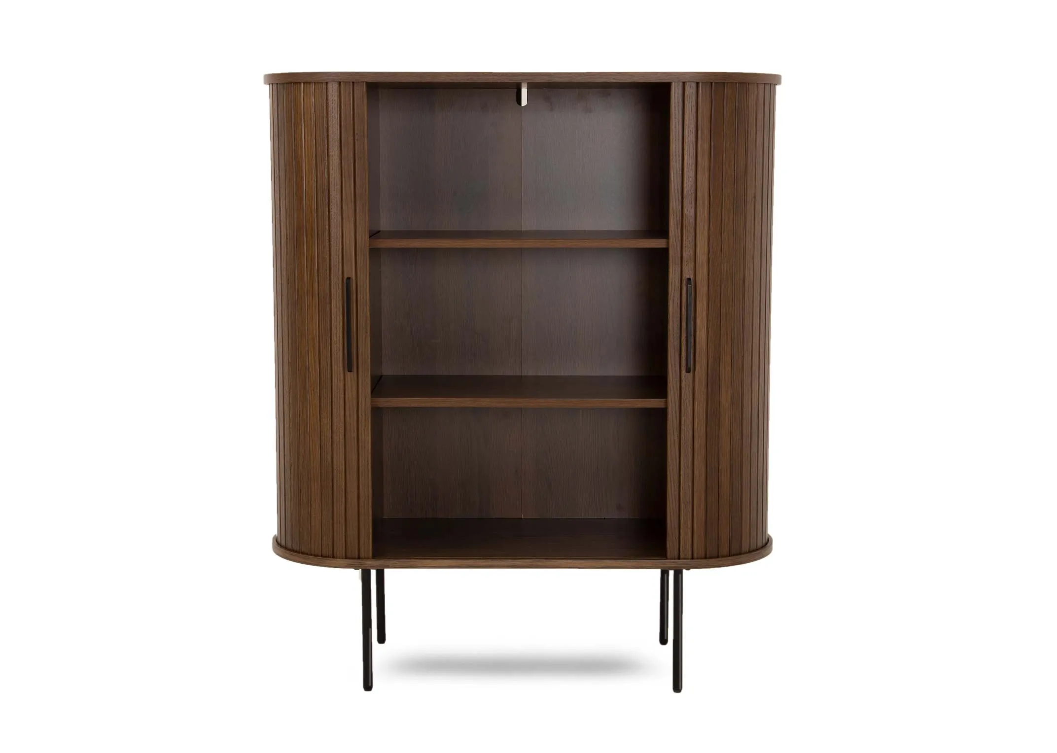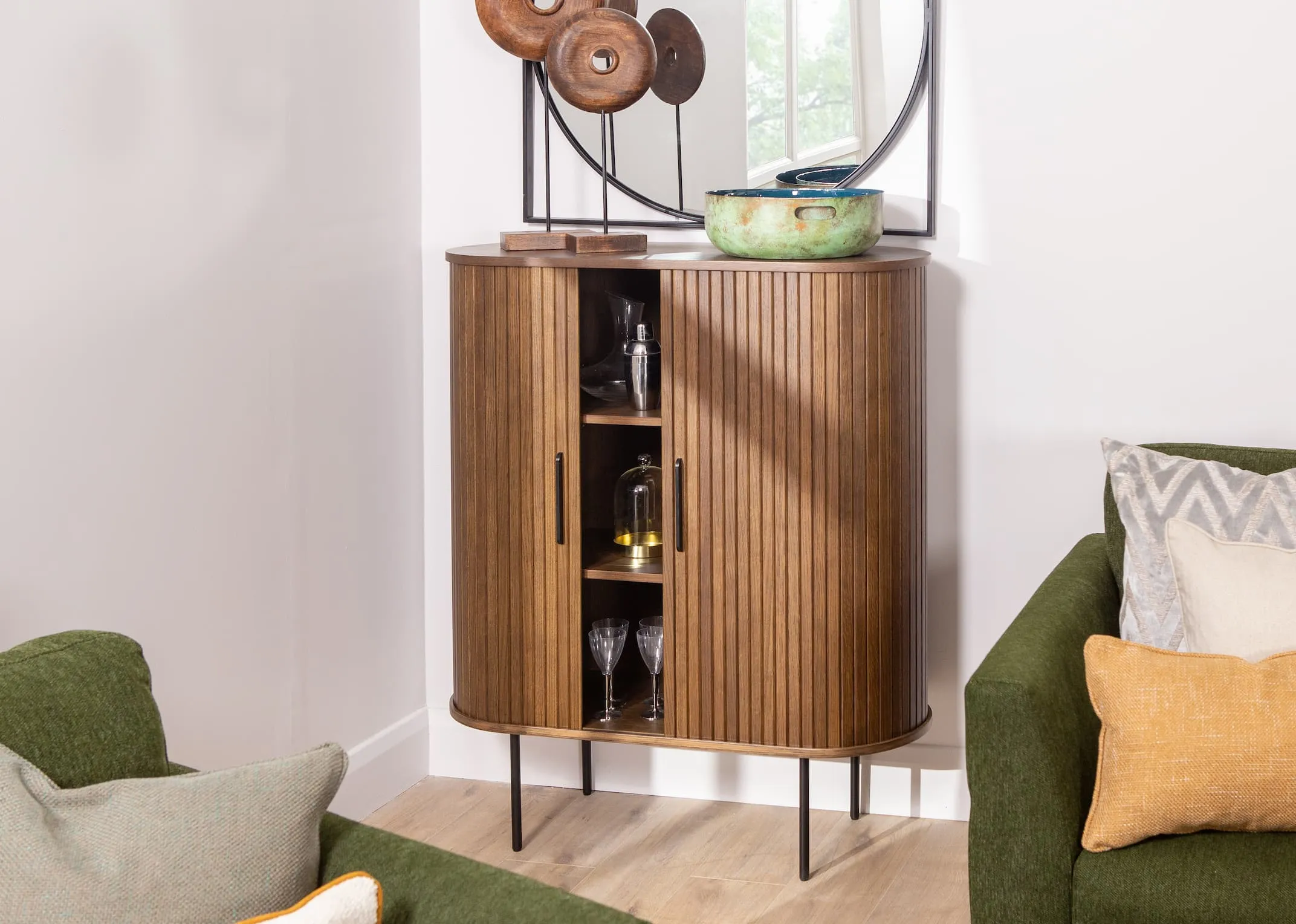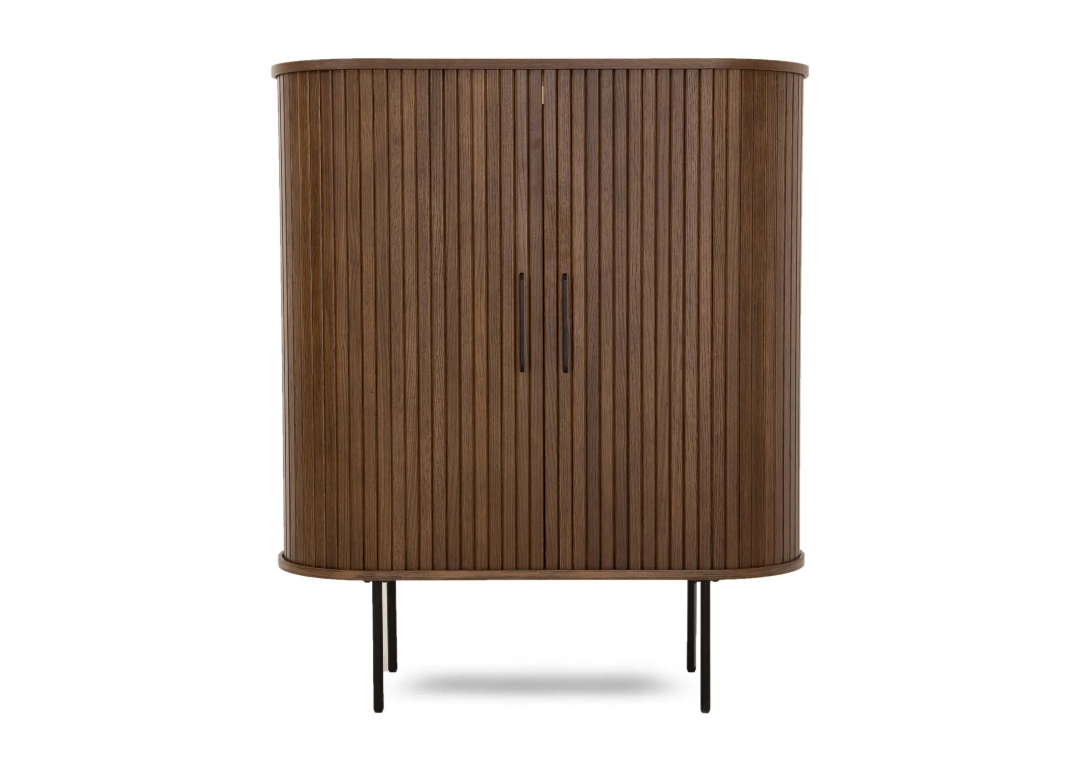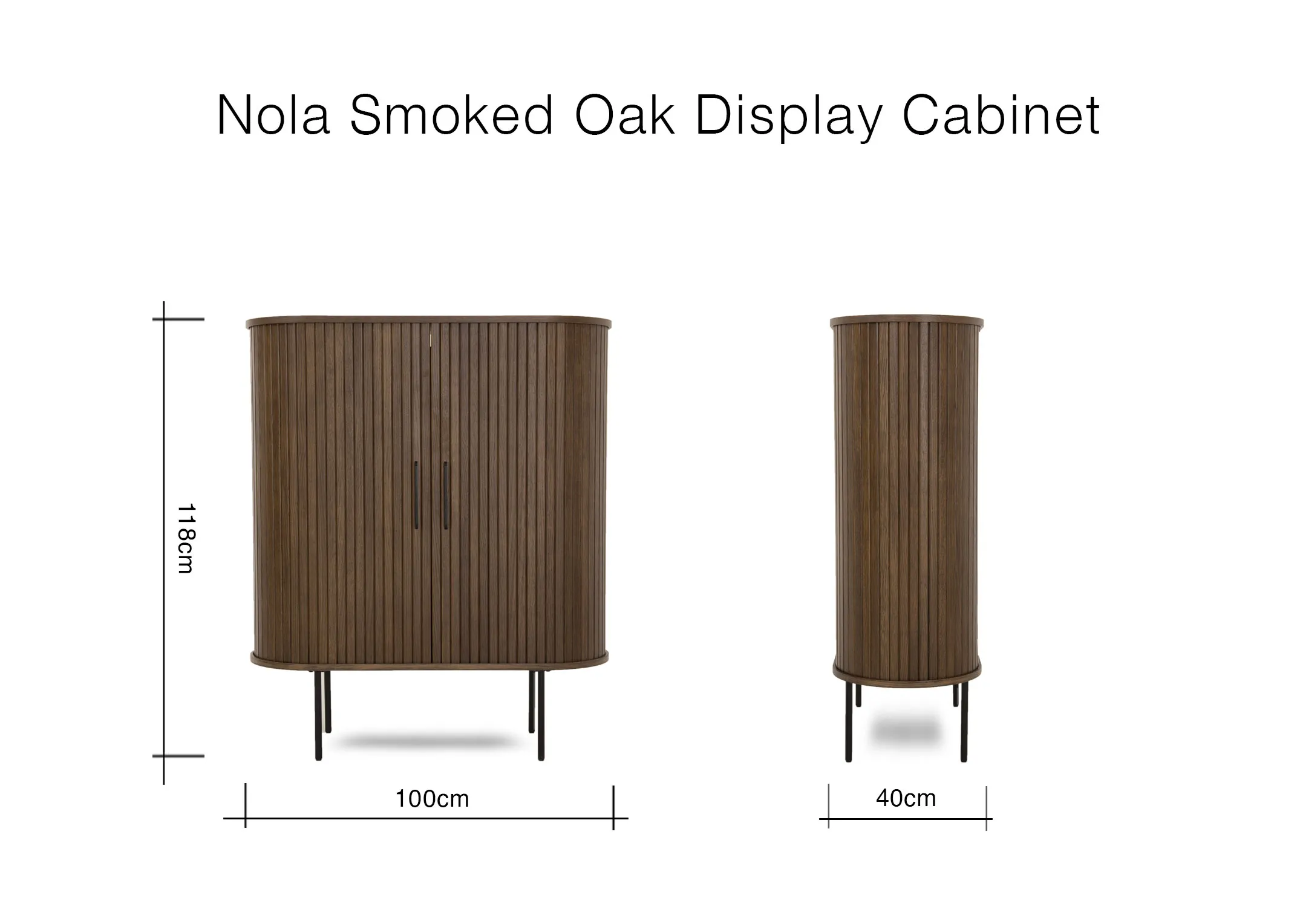 The Nola Tambour Door Smoked Oak Cabinet features sliding slatted doors that offer a sleek, contemporary twist on mid-century design.