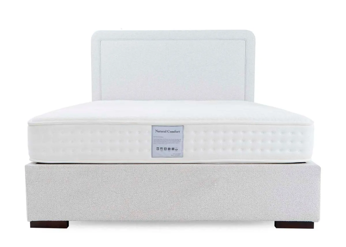 A cream fabric super king bed frame with thick base, simple and versatile to style high framed and padded headboard.