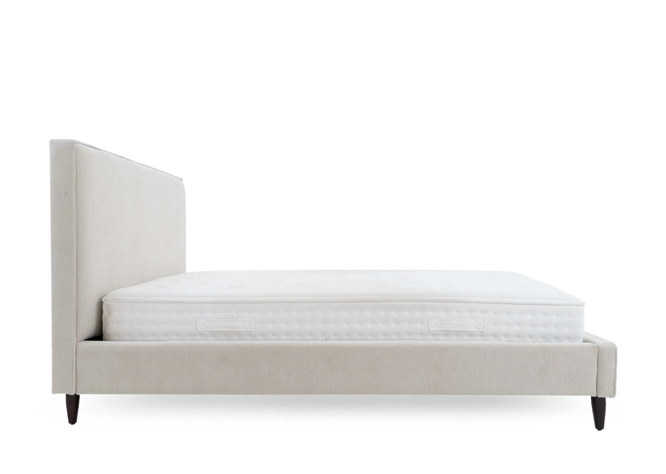 A dramatic high plain headboard creates a striking focal point on the Emilia bed frame with dark wood tapered feet to complete the piece.