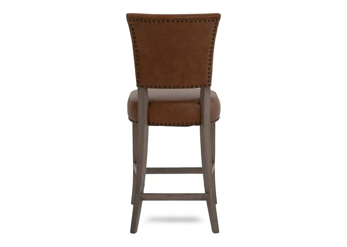 A tan leather counter bar stool with foam filled seats and backrest with a vintage ash grey wood leg.