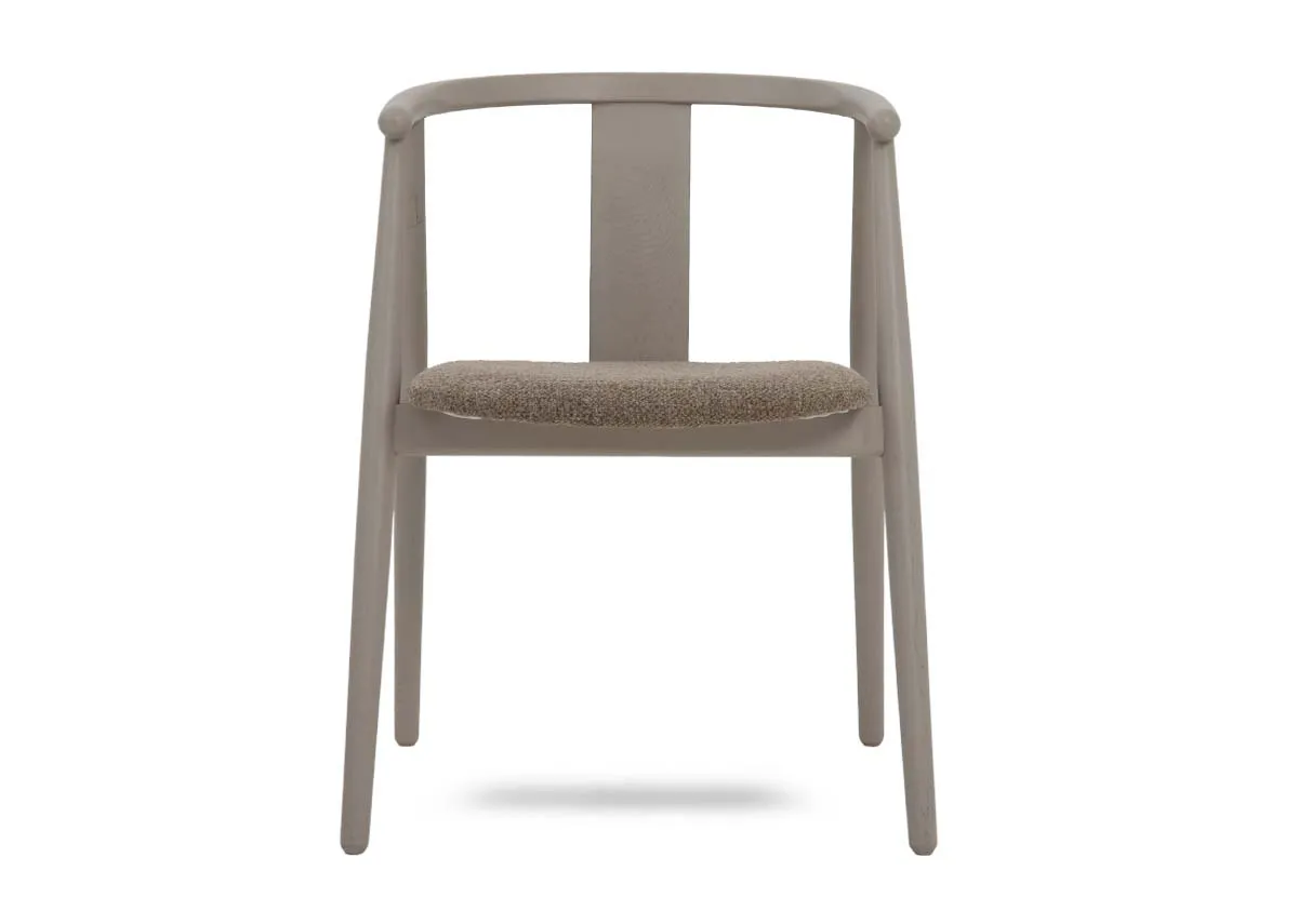 A taupe framed dining chair with straight panel and curved seat back for support and beige linen seat cushion for comfort.