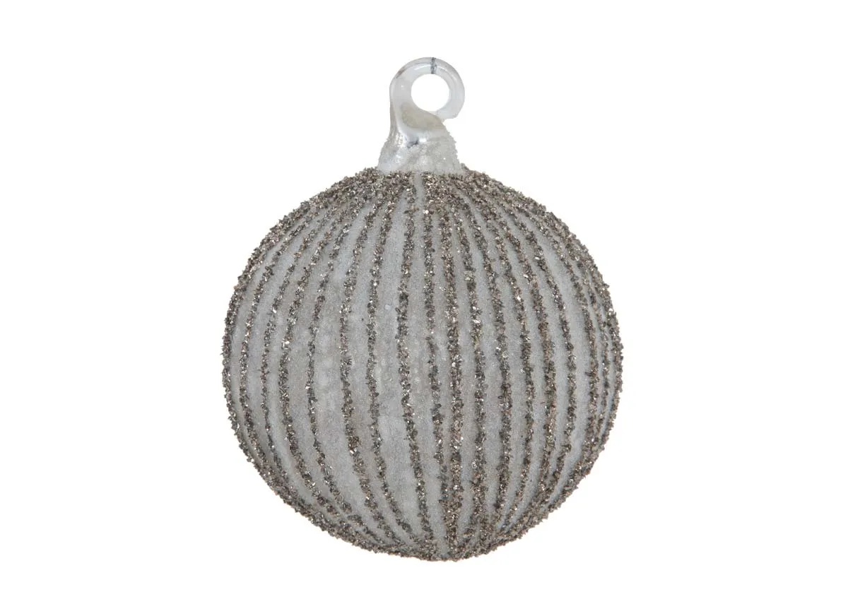 A set of light grey christmas 10cm baubles covered in a silver glitter ribbed effect giving a 3D vibe.